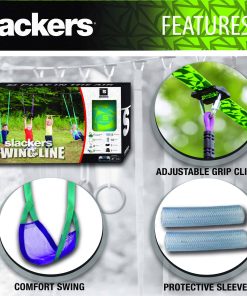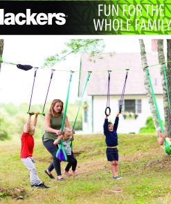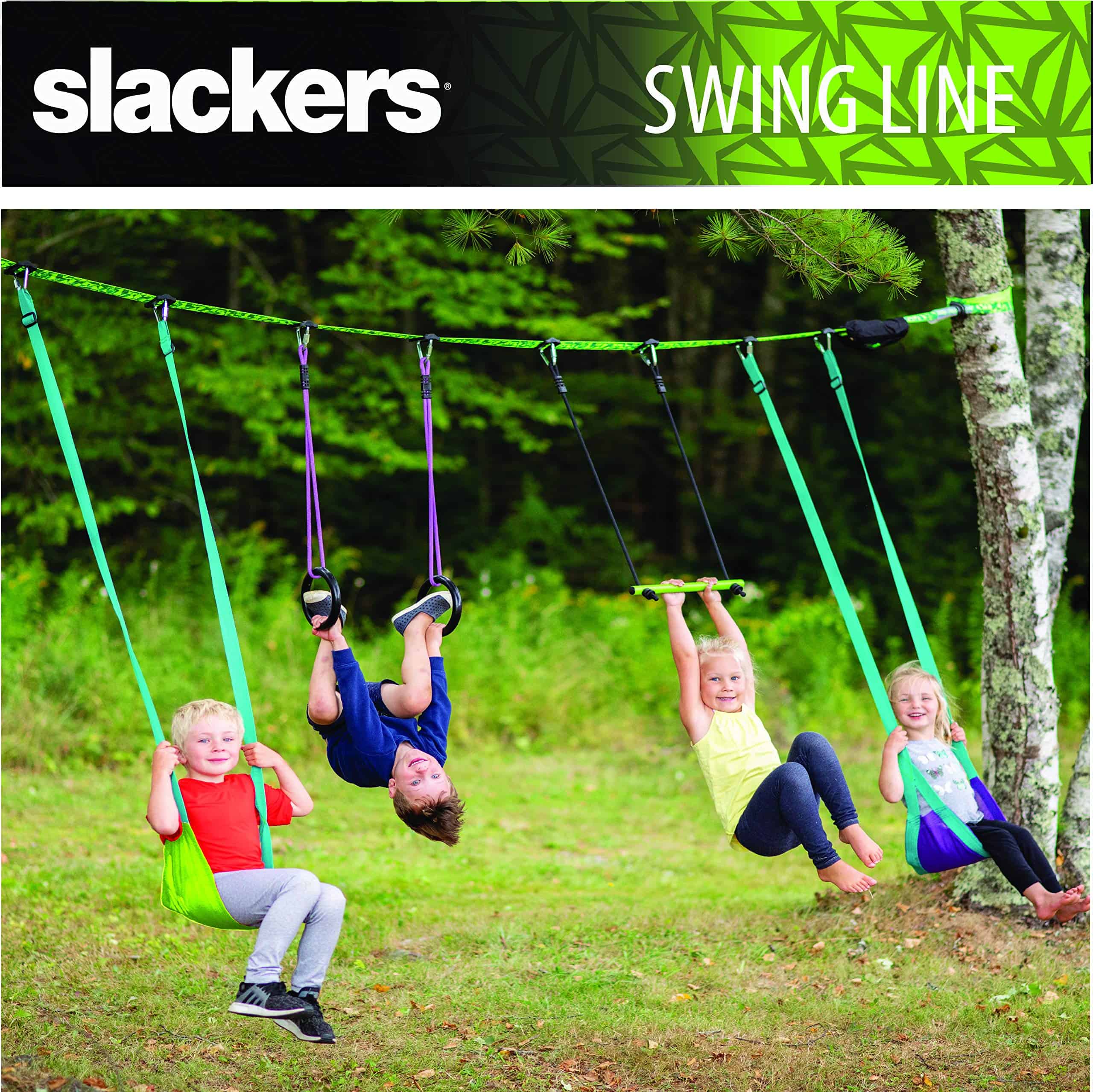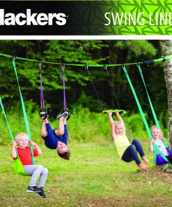 JUEGA EN EL AIRE…slackers es una empresa con sede en Colorado cuyo objetivo es inspirar a los niños a mantenerse activos y saludables. Ya sea poniendo a prueba su fuerza con los Anillos de Gimnasia, alcanzando nuevas alturas en el Asiento de Columpio Clásico, o simplemente colgando en las Barras de Mono, la Línea de Columpios es una excelente opción para mejorar la fuerza y el equilibrio mientras contribuye al desarrollo general de tu hijo. NIÑOS ACTIVOS Y SALUDABLES Con los desafíos que todos hemos experimentado recientemente, pudimos ver el verdadero valor de mantener activos, en forma y saludables a nuestros niños. Si te encuentras buscando una alternativa a los parques concurridos o una forma para que tu hijo se mantenga activo entre el trabajo escolar o después de clases, la Línea de Columpios slackers crea un divertido ambiente de recreo en casa que mantendrá a tu hijo en forma y saludable. Instalación: La instalación de la Línea de Columpios toma a un adulto un promedio de 30 minutos o menos utilizando el sistema de trinquete proporcionado. Incluye: 1 Línea de Columpios slackers 2 Asientos de Columpio Clásicos 1 Barra de Mono 2 Anillos de Gimnasia 1 Cubierta de Trinquete 1 Bolsa de Transporte Especificaciones Límite de Peso: 250 lbs. Edades Recomendadas: 3 + El kit de Línea de Columpios slackers cumple o supera todas las estrictas normas de seguridad de EE. UU. Se recomienda la supervisión de un adulto.