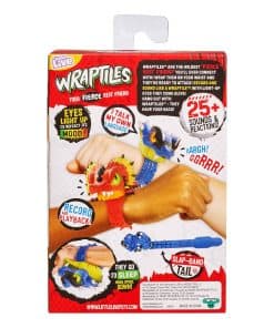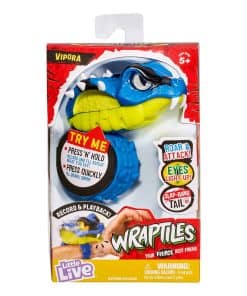¡Los Wraptiles son los amigos salvajes más feroz que jamás hayas tenido! ¡Envuelve su cola con pulsera ajustable alrededor de tu muñeca y estarán listos para atacar! ¡Observa como sus ojos se iluminan y cambian de color conforme a su estado de ánimo! ¡Tu Wraptile hará diferentes sonidos para indicarte en qué estado se encuentra! ¡Los Wraptiles tienen más de 25 sonidos y reacciones! Estas criaturas salvajes reaccionan a tu movimiento. ¡Agítalos y se marean! ¡Agítalos demasiado y se enojan! ¡Cuélgalos boca abajo de tu muñeca y se relajarán al dormir! ¡Graba un mensaje con tu reptil y él lo repetirá con su voz Snarly de Wraptile! ¡Coloca tu Wraptile junto a otro para que comiencen a charlar, reír y discutir en their idioma Wraptile! ¡Conoce a Víbora! Esta cobra azul es ágil, rápida y astuta. Ataca antes de que te des cuenta. Muchos encantadores de serpientes han intentado domarla, pero generalmente termina de dos formas: ¡Miedo o mordedura! ¡Pasa el rato con los Wraptiles – ellos te respaldan!