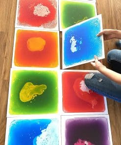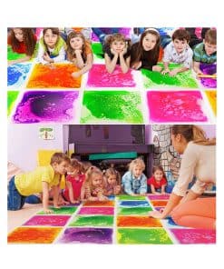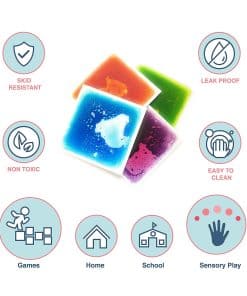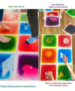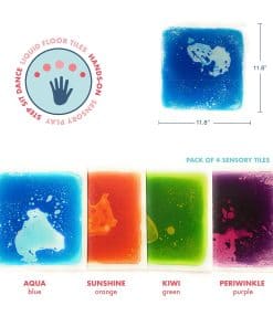 Las Baldosas Sensoriales Líquidas LittleAge están encapsuladas con líquido de colores brillantes que se transforma con cada paso, salto, baile o brinco creando patrones coloridos. Estas baldosas no adhesivas no necesitan instalación y son una excelente opción de suelo para salas sensoriales, áreas tranquilas y rincones acogedores de aulas. Pueden ayudar a mejorar las habilidades motoras gruesas y la concentración, y se pueden utilizar para jugar juegos interactivos y pueden beneficiar a los niños con autismo. Nuestras baldosas líquidas en el suelo pueden beneficiar a aquellos que necesitan estimulación sensorial extra y ayudar a los padres y maestros a mantener a los niños comprometidos. Este paquete de 4 viene en estos divertidos y brillantes colores: Azul Aqua, Naranja Sol, Verde Kiwi, Morado Periwinkle. Cada baldosa mide 11.8″x11.8″ pulgadas. Las baldosas sensoriales LittleAge son de calidad premium, probadas a presión para la durabilidad y construidas con un respaldo antideslizante para garantizar su seguridad.