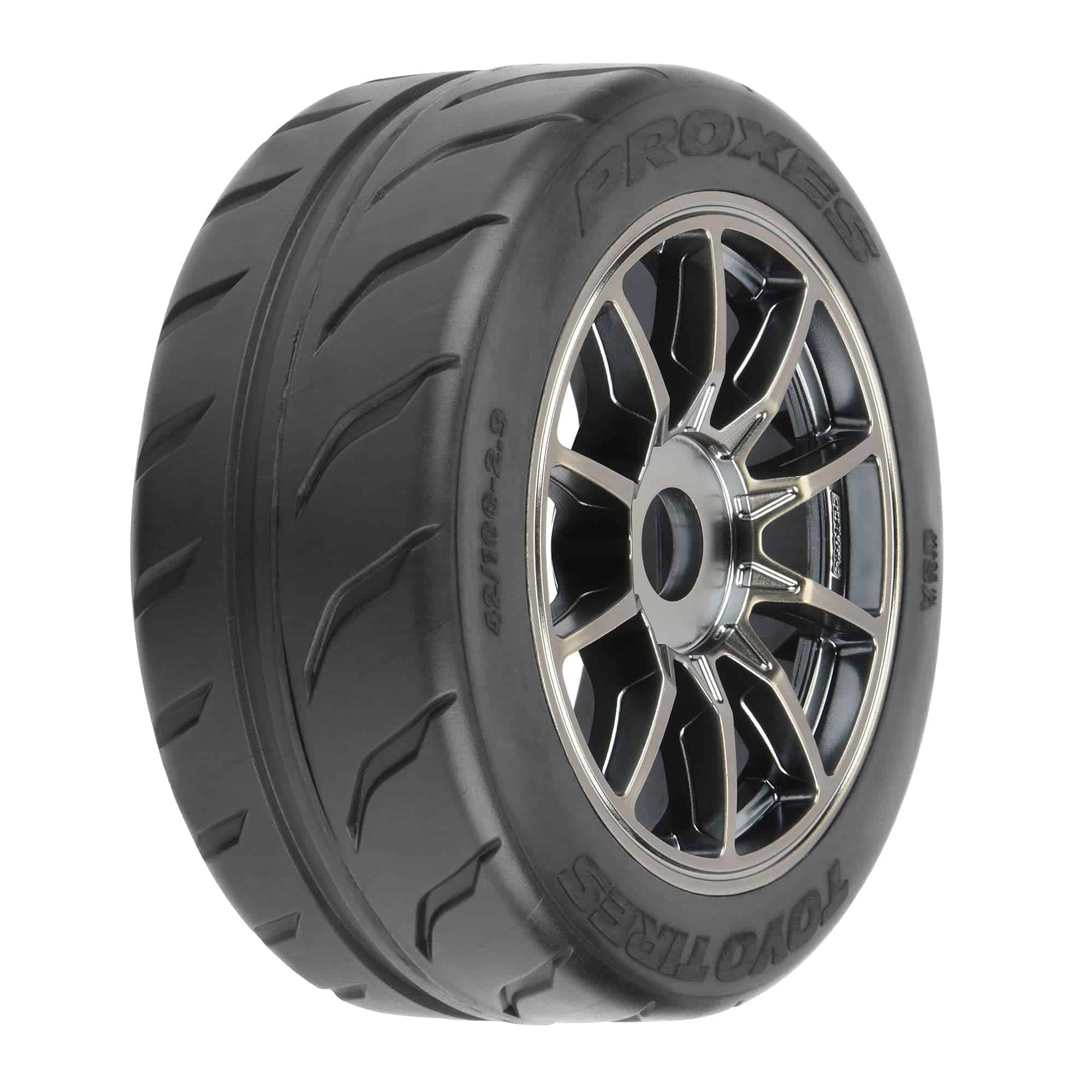 Este es un par de llantas Toyo Proxes R888R 42/100 2.9″ S3 (Suave) Street BELTED montadas en ruedas Spectre. ¡Pro-Line se enorgullece de anunciar una colaboración con uno de los principales fabricantes de neumáticos de alto rendimiento – Toyo Tires! Esta colaboración comienza con nuestro primer neumático para la popular línea de vehículos Street Bash de ARRMA 1/7 – el Toyo Proxes R888R. Todos los detalles del neumático de competición de alto rendimiento a escala real se han recreado para dar a tu Infraction o Limitless la máxima apariencia a escala, rendimiento en carretera y durabilidad duradera. El Proxes R888R es conocido por su agarre extremo, capacidad de giro y estabilidad de frenada en el mundo a escala real en pista, y no es diferente en el mundo RC, ya que estos neumáticos transformarán el manejo de tu coche o camión. Los grandes bloques de banda de rodadura en la banda de rodadura exterior maximizan el agarre lateral mientras que la amplia nervadura central mejora la estabilidad direccional para carreras a toda velocidad. Un cinturón de alto rendimiento tejido en patrón de espina de pescado refuerza el interior de los Proxes para carreras a alta velocidad, mientras que nuestro compuesto S3 proporciona un desgaste duradero del neumático. Ahora de Pro-Line es la rueda Spectre de 10 radios. Inspirada en las ruedas de carreras GT3 1:1, la Spectre le da a tu Infraction, Felony o Limitless un aspecto nuevo y llamativo con un acabado satinado de color gris metálico y sorprendentes detalles a escala. La combinación Proxes/Spectre viene preensamblada, por lo que no tienes que preocuparte por pegar tus neumáticos y esperar a que se sequen. ¡Obtén el máximo agarre y estabilidad para que puedas ser más rápido que tus amigos con los neumáticos de calle BELTED Toyo Proxes R888R de Pro-Line! También disponible en tamaño de 53/107 2.9″ para la parte trasera de tu ARRMA Felony (PRO1020010). Ten en cuenta que estos neumáticos tienen una velocidad máxima que, si se excede, podría resultar en daños permanentes en el cinturón interno. Para los neumáticos Proxes 42/100 es de 100 mph o aproximadamente 8500 RPM.