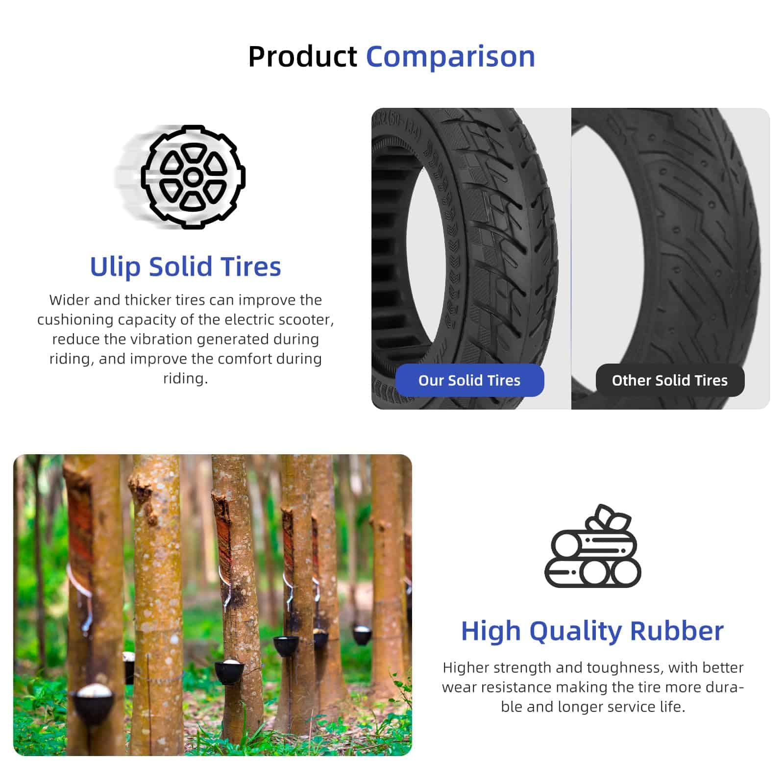 Llanta sólida de repuesto para patinete eléctrico delantera y trasera diseñada para los scooters VSETT 9 9+ ZERO 9 Inokim Light 2. Hecho de caucho renovable duradero con roscas estriadas para un mejor agarre, resistente a la explosión, resistente a la presión y al desgaste. Las líneas antideslizantes hacen que sea utilizable en condiciones de carretera nevada y lluviosa. La estructura interna hueca ayuda al scooter a tener una mejor absorción de impactos, disipación de calor y sensación de la carretera. Buena recuperación y elasticidad mantienen alejado de situaciones de reventón y pinchazo de neumático, sin necesidad de inflado o reparación, un imprescindible para tu scooter. Fácil instalación – calentar el neumático sólido en agua hirviendo, lubricar con vaselina o agua jabonosa y luego instalar en el cubo. ulip es un fabricante profesional y reconocido mundialmente de accesorios para scooters eléctricos, fabricamos y vendemos diversos accesorios en todo el mundo.