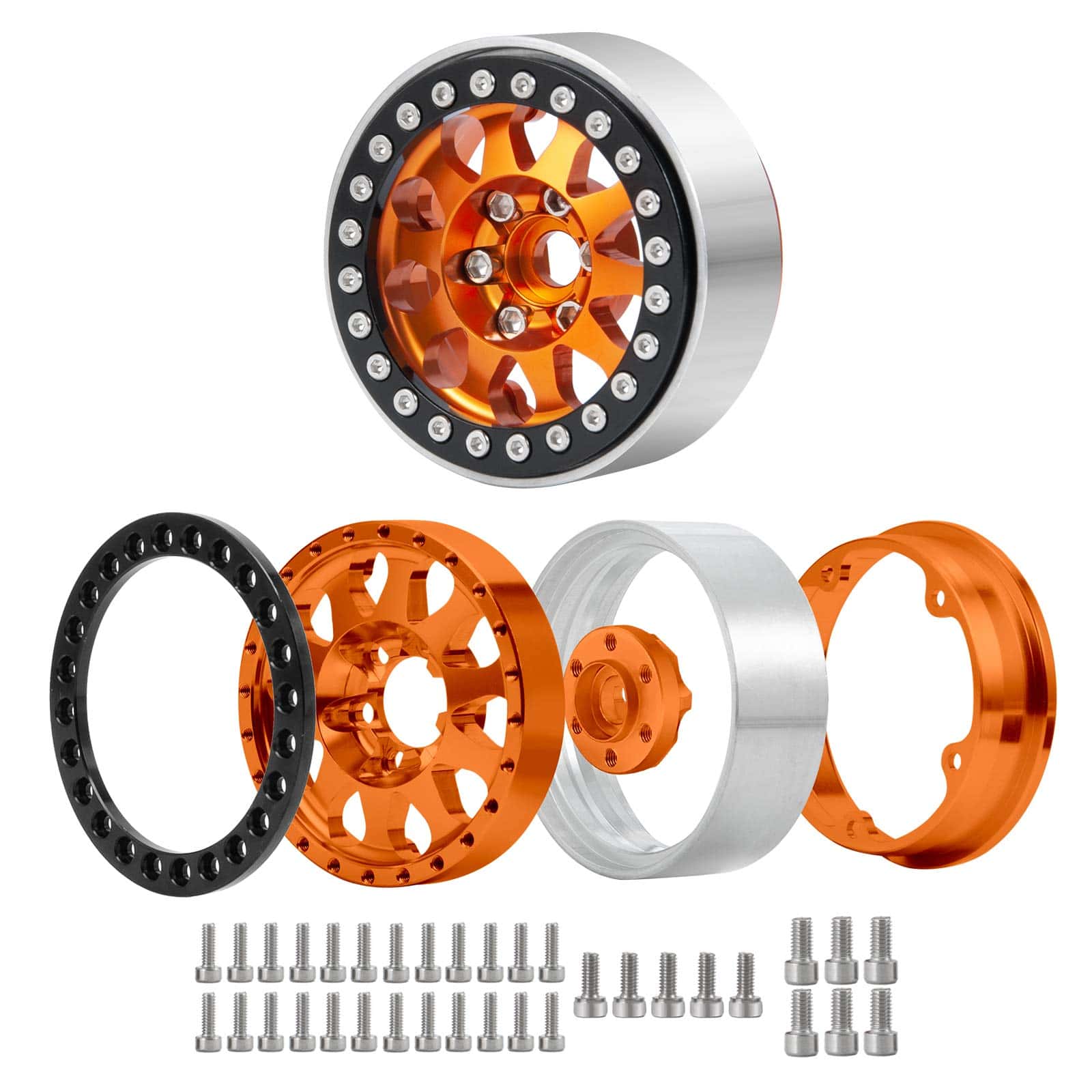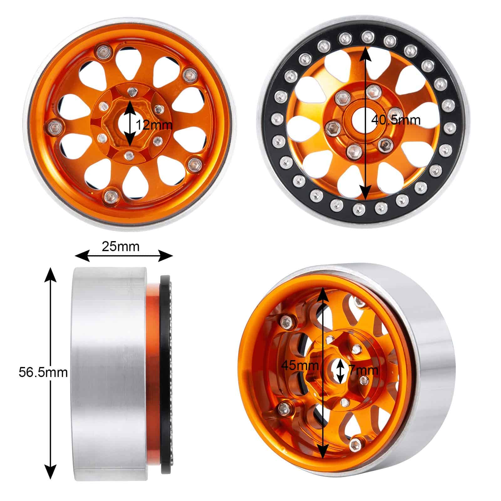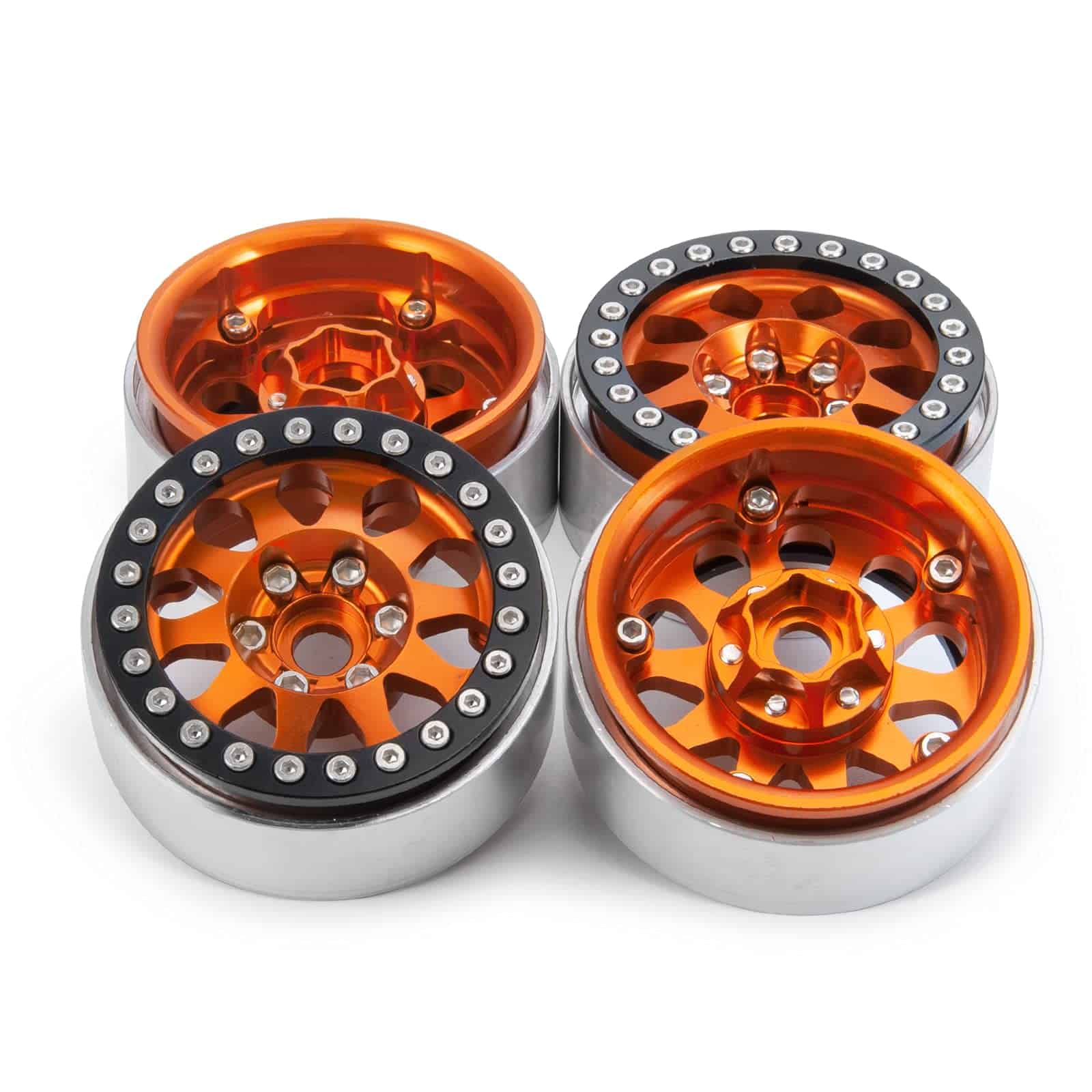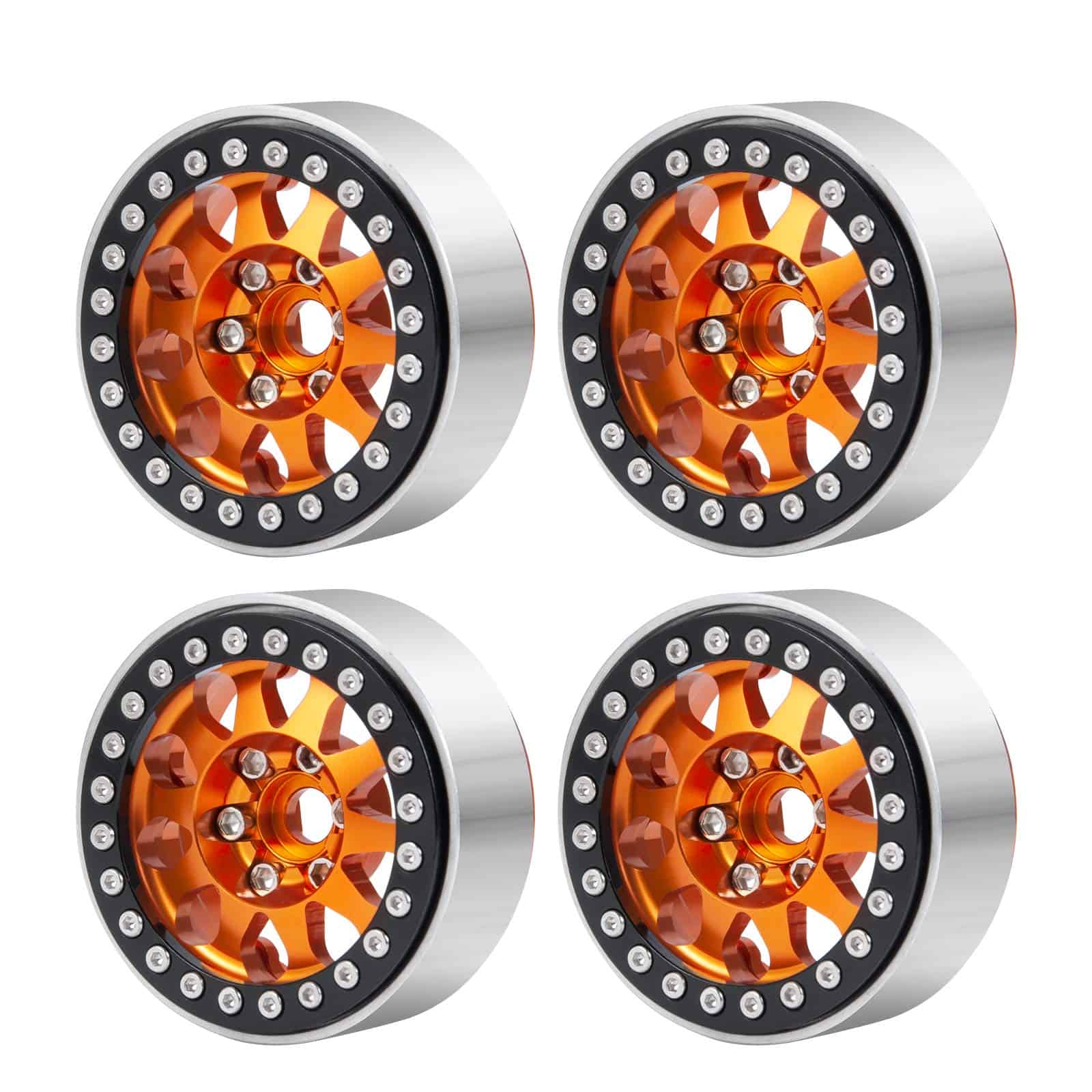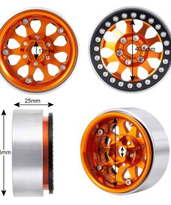 Llantas Beadlock de 1.9 pulgadas para coche RC Crawler 1/10 TRX4 TRX-6 Axial SCX10 90046 SCX10 III AXI03007. 100% nuevo y duradero. Mano de obra fina y estilo perfecto. Apto para RC Rock Crawler 1/10 TRX4 TRX-6 Axial SCX10 90046. Estas llantas vienen con tornillos para fijar el neumático. Material: metal. Color: Negro/Plata/Gris/Naranja. Diámetro exterior: 56mm. Diámetro interior: 45mm. Grosor: 25mm. Hexágono de conducción: 12mm. Peso: 280g/set. Lista de paquetes: 4 x Llantas RC Beadlock de 1.9 pulgadas. Importante: Este accesorio RC se aplica solo a coches RC 1:10. Si faltan los accesorios, contáctenos.