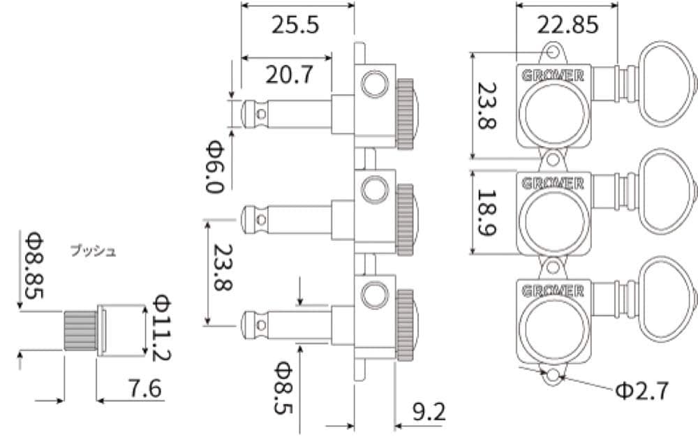 El diseño de la serie 505FV te permite actualizar los afinadores vintage de Fender a un afinador de bloqueo de estilo más moderno sin hacer NINGUNA modificación a tu guitarra. El diseño de oreja superpuesta te permite utilizar los agujeros de tornillo existentes y el uso de casquillos de inserción, en lugar de tornillos, significa que no se requieren modificaciones en los agujeros de los postes. Estos afinadores en línea cuentan con el famoso ratio de 18:1 y mecanismo de bloqueo de tornillo de pulgar. Nota: Si estás construyendo una nueva guitarra o adaptando una guitarra para afinadores vintage, Grover sugiere utilizar una broca de 21/64 para taladrar o volver a taladrar los agujeros si es necesario un agujero de .328.