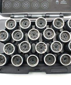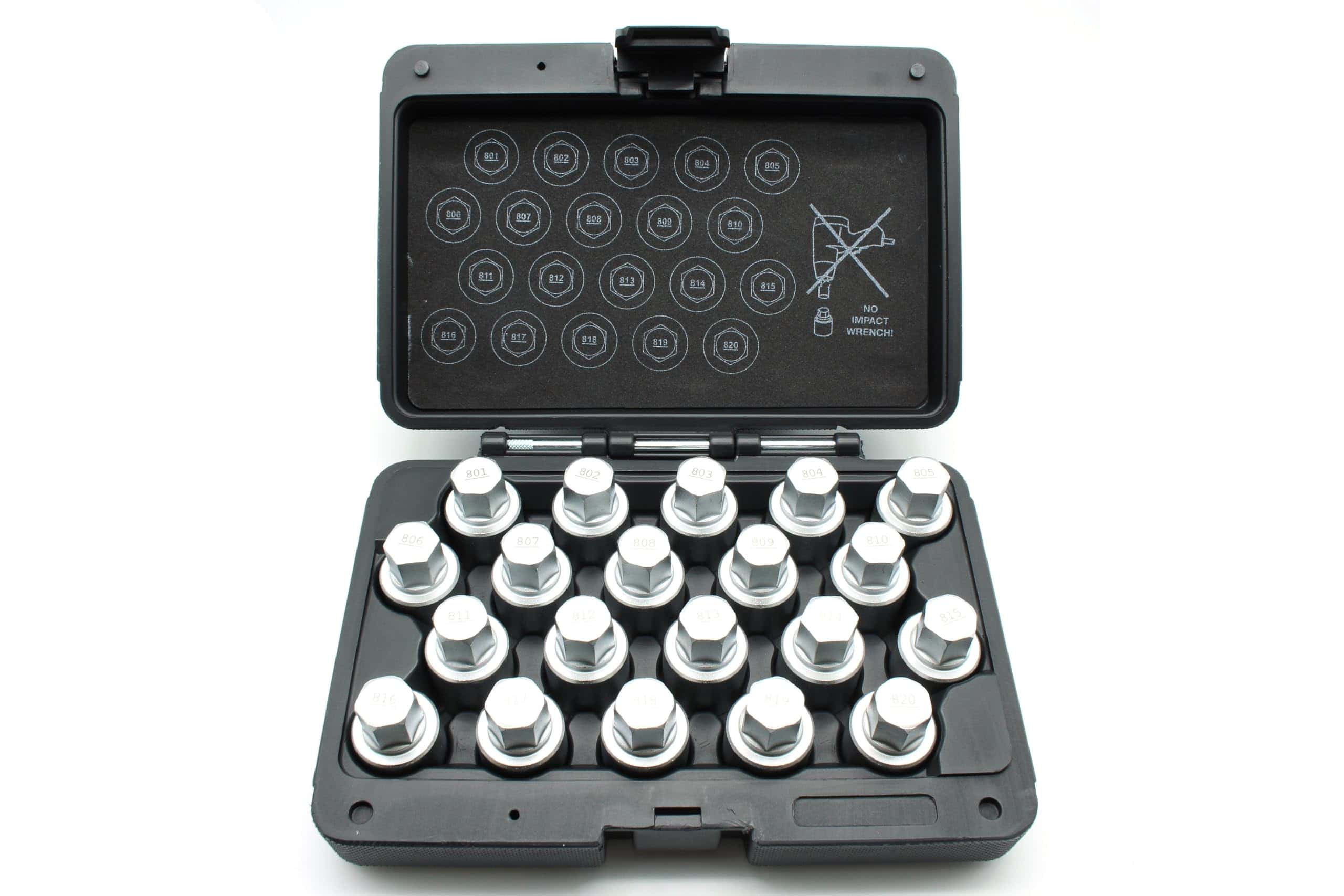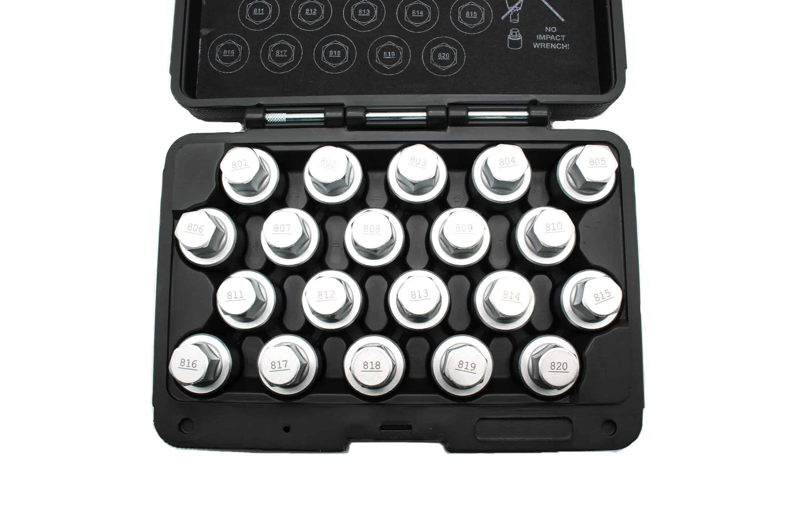 El set incluye 20 llaves del 801 al 820. Todas son llaves para diferentes modelos de Audi. Alinee el socket con la tuerca firmemente; gire en sentido contrario a las agujas del reloj para aflojar las tuercas. No está diseñado para usarse con llave de impacto. La superficie interior negra de cada llave está hecha con recubrimiento de fosfato de manganeso. Para determinar qué llave necesita, empareje visualmente el patrón de la llave con las tuercas de seguridad en su vehículo. La compatibilidad de la llave no se basa en la marca, modelo o año del vehículo. Al quitar las tuercas, es mejor aflojar de manera uniforme cada tuerca en la rueda en lugar de quitar una por vez, esto ayuda a reducir la presión sobre las tuercas restantes.