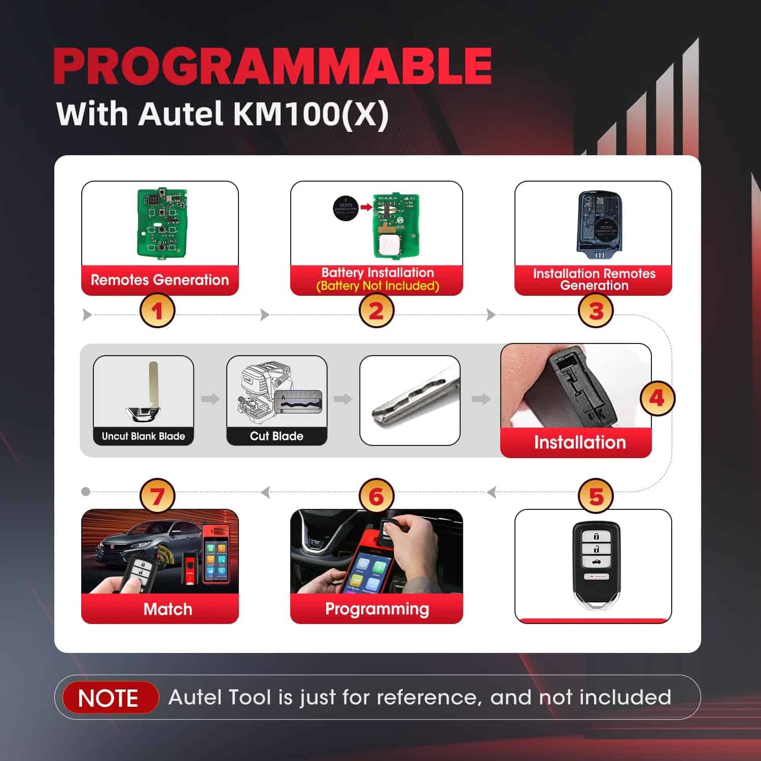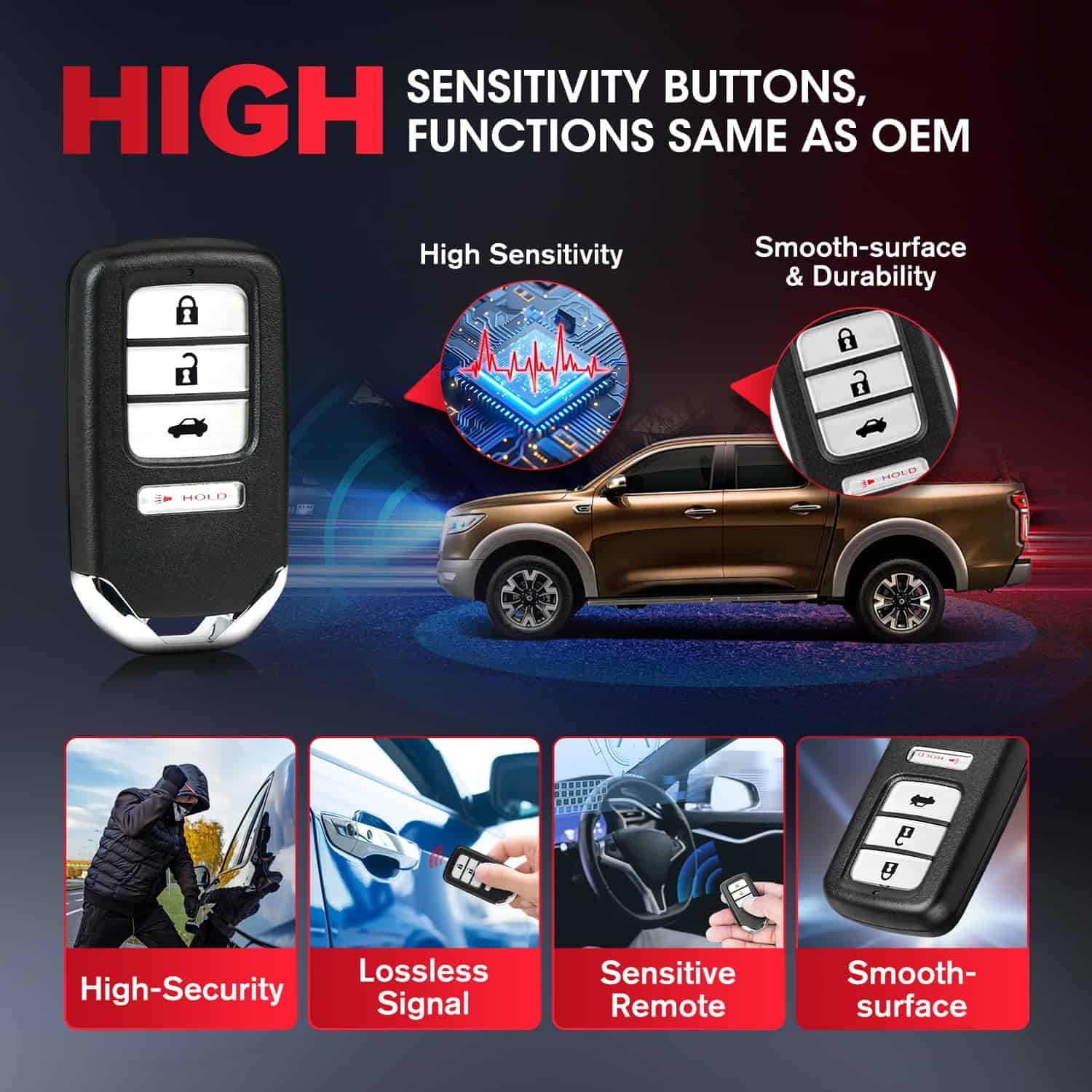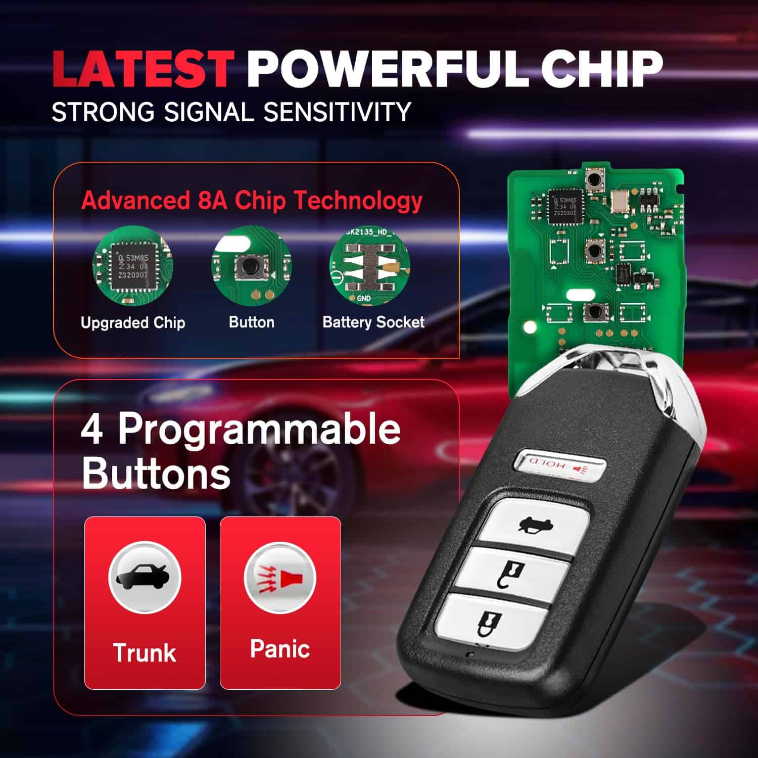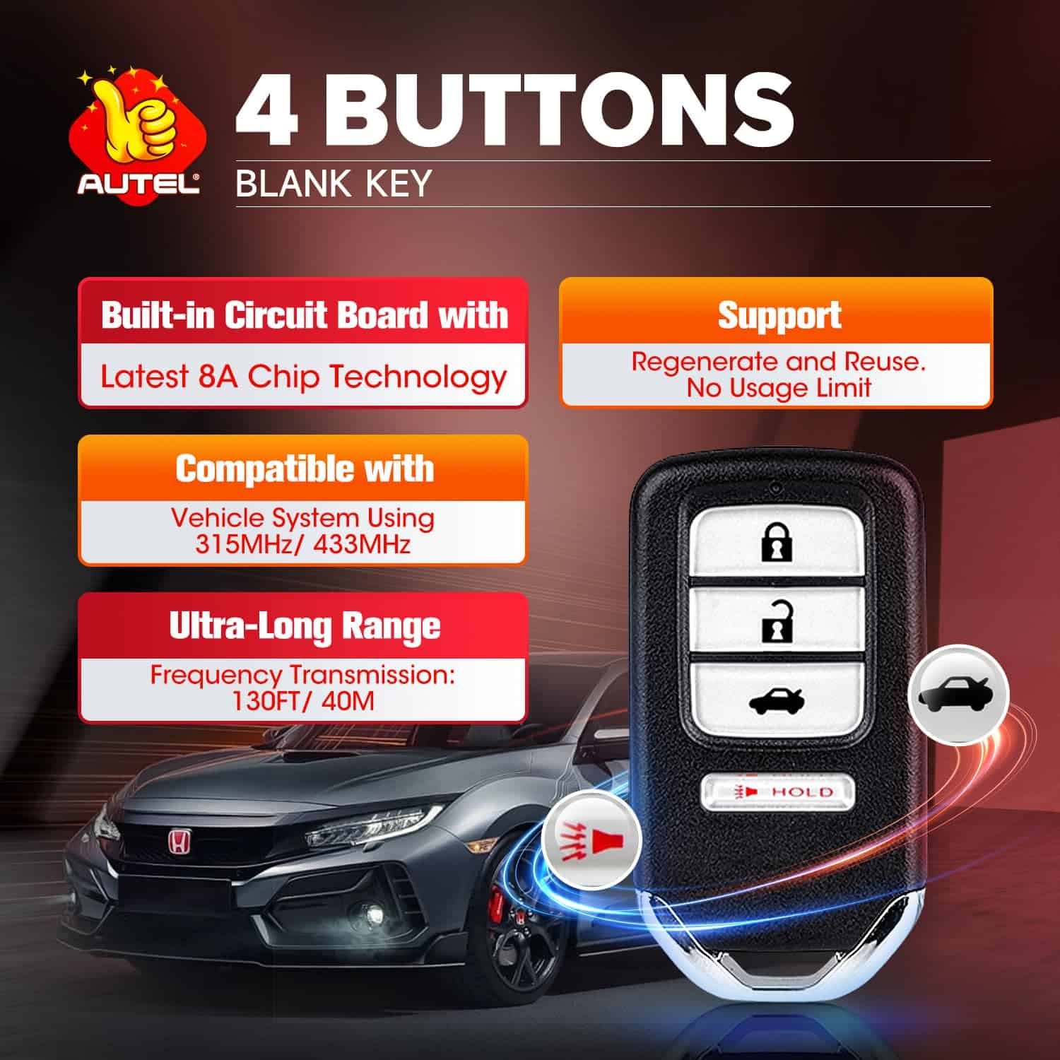 Este es un reemplazo de llave en blanco Autel MaxiIM, modelo IKEYHD004AL, diseñado para vehículos Honda. Esta llave programable de alta calidad viene con 4 botones y opera en una frecuencia de 315/415 MHz, con un alcance remoto de 130 pies/40 metros. Debes tener en cuenta que la batería (CR2032) no está incluida y que la llave debe ser programada antes de su uso. Se requiere la herramienta Autel MaxiIM para la programación de esta llave. Si no posees la herramienta de programación, se recomienda llevar el artículo a un profesional o concesionario para su corte y programación. La llave en blanco viene con una hoja de rescate que debe ser cortada según las especificaciones de tu vehículo. Este reemplazo de llave de proximidad manos libres está construido con la última tecnología y está diseñado para satisfacer los estándares de seguridad de la industria. Es compatible con una variedad de vehículos que utilizan acceso con botón de encendido y cuenta con un transmisor multifrecuencia de 315MHz/434MHz. Los botones de esta llave tienen alta sensibilidad y funcionan de la misma manera que el original de fábrica. Es importante asegurarse de que tu mando a distancia original tenga los mismos botones que el modelo de la llave en blanco. Esta llave remota es capaz de transmitir a larga distancia, soportando una frecuencia de 315/415 MHz y con un alcance remoto ultra largo de 40 metros/130 pies. La programación de esta llave en blanco es sencilla y puede ser realizada en vehículos compatibles en tan solo un minuto con las herramientas de programación de Autel MaxiIM. Para una lista detallada de modelos de vehículos compatibles, consulta el manual de tu herramienta de programación. Recuerda que este artículo no es universal y su compatibilidad depende de la cobertura de vehículos de la herramienta utilizada para la programación. Si posees alguna pregunta o inquietud, no dudes en contactarnos. Ofrecemos soporte las 24 horas, los 7 días de la semana, los 365 días del año.