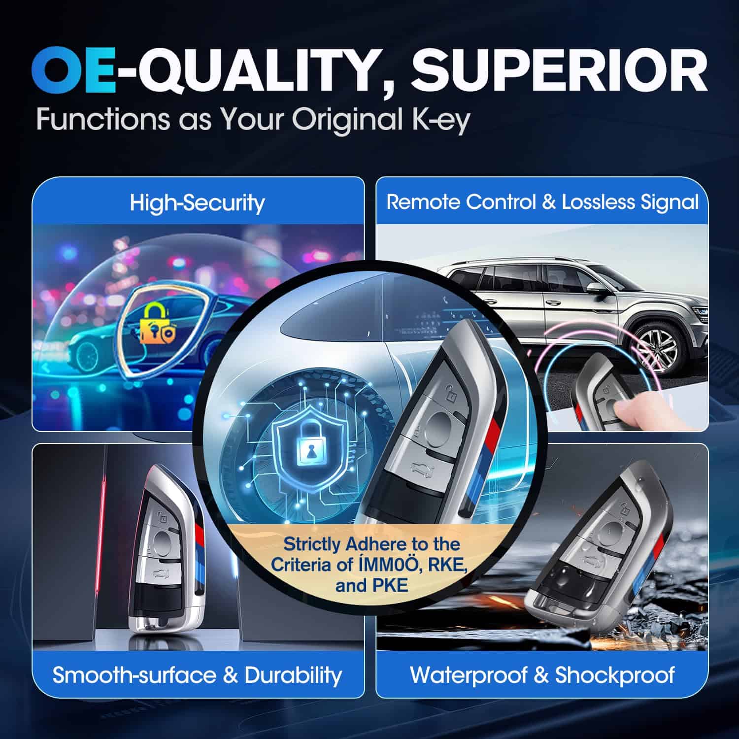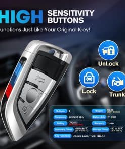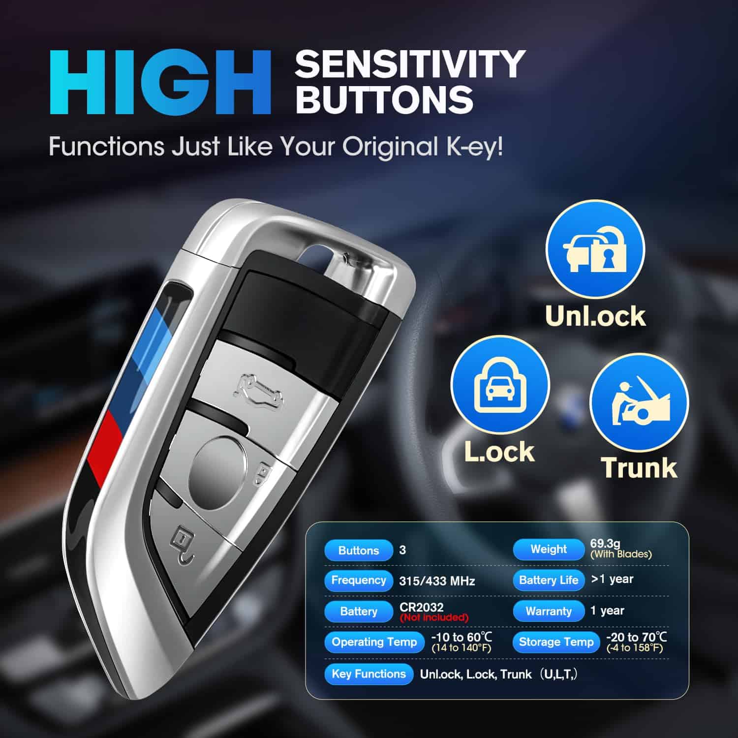 3. Botones de alta sensibilidad, funciones iguales que OEM: Hecho de materiales de ingeniería premium para soportar calidad anticaída, y la función es la misma que la llave de coche original de fábrica, incluye funciones de Bloqueo, Desbloqueo y abrir la cajuela. Diseño 1:1 para reemplazar rápidamente y fácilmente su llave fob remota perdida o rota. Tenga en cuenta: ¡Por favor asegúrese de que su llave fob original tenga los mismos botones!