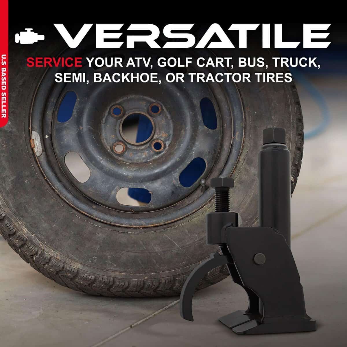 Su construcción reforzada con acero premium garantiza durabilidad y resistencia, mientras que el gancho grueso y las patas endurecidas aseguran un agarre potente en la llanta. Es fácil de usar, simplemente coloca las patas y el pie del rompe talón entre la llanta y el talón del neumático, aprieta la abrazadera del gancho y gira la tuerca del rompe talón para aflojar el talón del neumático de la llanta.