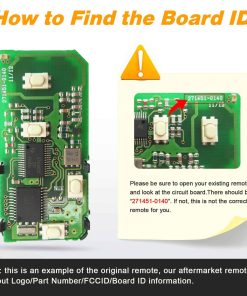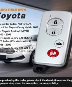 Reemplazo completo del control remoto con batería instalada. Favor de verificar el ID de la FCC/Número de parte en el lado del control original antes de la compra. Compatible con Toyota Avalon LIMITED 2007-2009, Toyota Camry 2.4L Hybrid A/T Sedan (VIN comienza con 4) 2008-2009, Toyota Camry 3.5L A/T XLE (VIN comienza con 4) 2007-2009. Solo compatible con sedán, no apto para SUV. Botones: Bloquear, Desbloquear, Maletero, Pánico. Requiere cerrajeros calificados o concesionarios para la programación. Auto-programación no disponible. Cada control remoto sin llave viene completo con batería/chip/placa remota/llave de emergencia sin cortar.