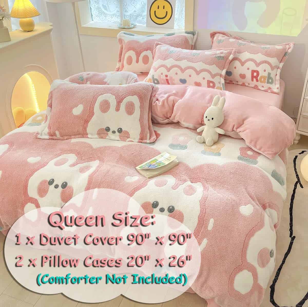 1. PATRÓN LINDO: El patrón de conejito y el patrón de flores son muy lindos y encantadores, creo que ella/el se enamorará de él a primera vista. Queremos crear un mundo cálido y amoroso para tus hijos. 2. ULTRA SUAVE: 100% microfibra de alta calidad, 100% ULTRA SUAVE. Hecho de Piel de Felpa Larga y franela de alta densidad, transpirable y sin arrugas, cálido, acogedor, suave y cómodo. La tela duradera no se apelmaza fácilmente después de lavados frecuentes. 3. ¿QUÉ PUEDES OBTENER? : 1 funda de edredón (90″x 90″), 2 fundas de almohada con cierre de cremallera (20″x26″). Nota: Las colchas y sábanas no están incluidas. 4. USO MÚLTIPLE: Durante los meses más fríos, puedes meter tu edredón en esta lujosa funda de edredón y sentirás el calor en todo tu cuerpo. En las estaciones calurosas, puede usarse solo como manta de cama. Adecuado para habitación, habitación de invitados, habitación de niños, dormitorio y dormitorio universitario. Esta preciosa funda de edredón es una buena elección como regalo de cumpleaños o regalo especial para tus seres queridos niños, niñas, niños pequeños, adolescentes, buenos amigos, familia. 5. FÁCIL USO Y CUIDADO: Nuestra funda de edredón peluda tiene cierre de cremallera metálica oculta para abrir y cerrar fácilmente. 4 lazos en las esquinas pueden mantener tu edredón en su lugar. Cuidado fácil: lavado a máquina suave en agua fría y secado en secadora a baja temperatura. Por favor, no uses lejía.