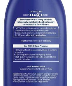 La piel de todos necesita un poco de cuidado extra. La Loción Corporal NIVEA Original Daily Moisture es una fórmula cremosa, infundida con nuestro Deep Moisture Serum y Vitamina E para nutrir e hidratar intensamente la piel normal a seca. Perfecta para uso diario, la loción Original Daily Moisture suavizará la piel y proporcionará una hidratación profunda durante 48 horas. La piel hermosa está más cerca de lo que piensas.