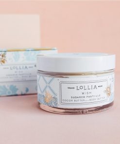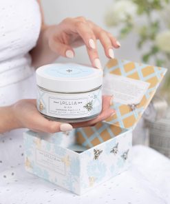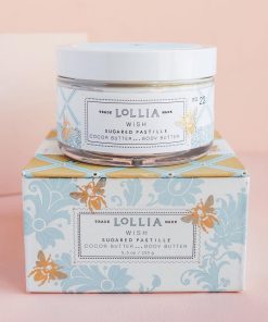 Lollia Wish Body Butter presenta una delicada infusión de fragancia de Vainilla Cálida, Flor de Arroz, Hojas de Jazmín y Azúcar de Caña triturada para dejar la piel deliciosamente perfumada. Sumérgete en la hidratación divina con el reconfortante Aloe y Manteca de Karité para envolver tu cuerpo en una hidratación exuberante, mientras la Manteca de Cacao y el Aceite de Aguacate dejan tu piel radiante. Las abejas doradas están inclinadas en un zumbido azul alrededor de esta elegante caja con tapa.