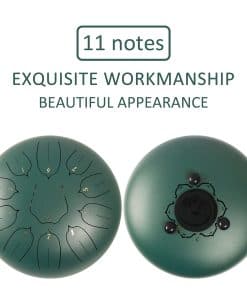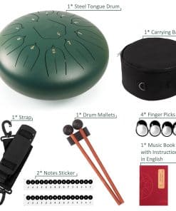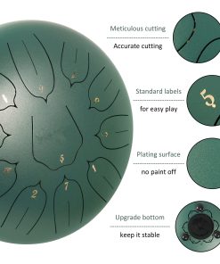 Diseño bueno. Lengüeta de flor de loto, es simple en estructura, el sonido es muy agradable y es una especie de sonido como los tonos de Buda. Fácil de aprender, incluso los principiantes pueden dominar fácilmente y tocar música maravillosa. Métodos de disfrutar. Tocando con Mazas Sostén la maza ligeramente y deja que caiga y brinque en la nota. Tocar con las Manos Para lograr la técnica de tocar con las manos, usa la almohadilla de solo un dedo para golpear la nota. Tocando con Púas La púa es otra forma de crear el tono ideal, si estás familiarizado con el tambor, puedes intentarlo. Tamaño: 11 notas 12 pulgadas – 12.9 x 12.8 x 8.3» Peso: 7.7 libras 1 tambor de acero 1 par de mazas 1 libro de música 1 bolsa 1 juego de pegatinas de notas 1 juego de púas