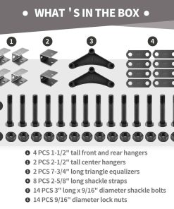 2. EL PAQUETE INCLUYE: (2) Equilibradores triangulares de 7-3/4″ de largo, (8) Correas de grillete 262L, (4) Abrazaderas delanteras y traseras de 1-1/2″ de alto, (2) Abrazaderas centrales de 2-1/2″ de alto, (14) Pernos de 9/16″ y tuercas.