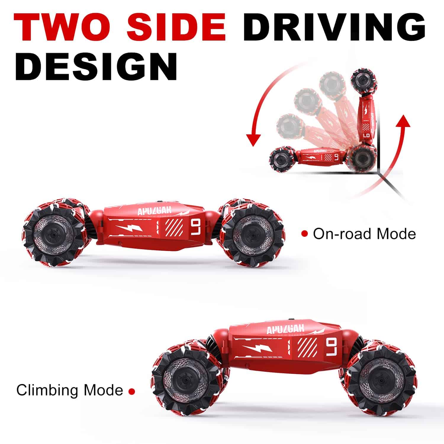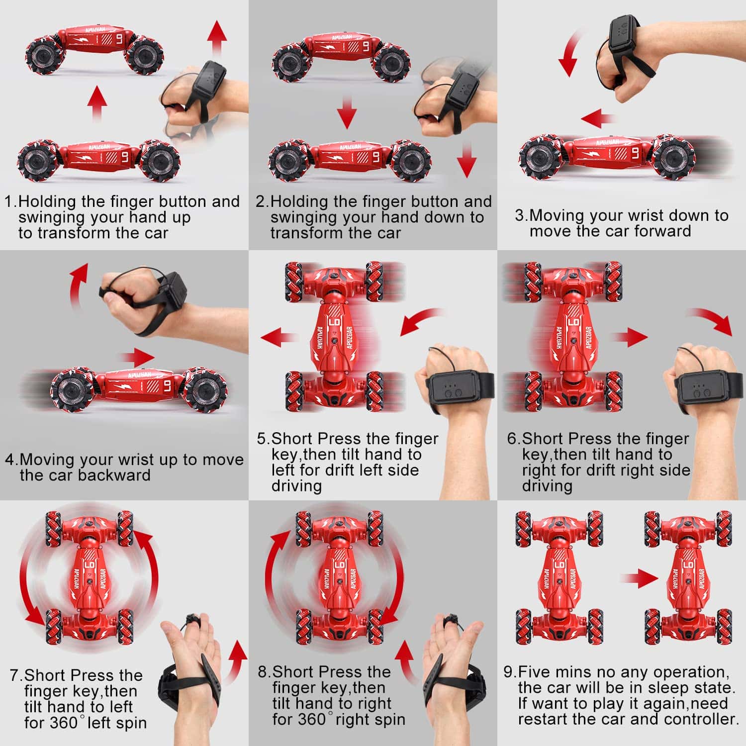 3. ACROBACIAS FUNCIONALES COMPLETAS Funciones Principales: Adelante/atrás, girar a la derecha/izquierda, derrape a la derecha/izquierda, giros extremos de 360 grados, conducción 4WD de doble cara, modo de transformación, una tecla para encender/apagar la música, luces coloridas, pulverización de niebla, función de demostración.