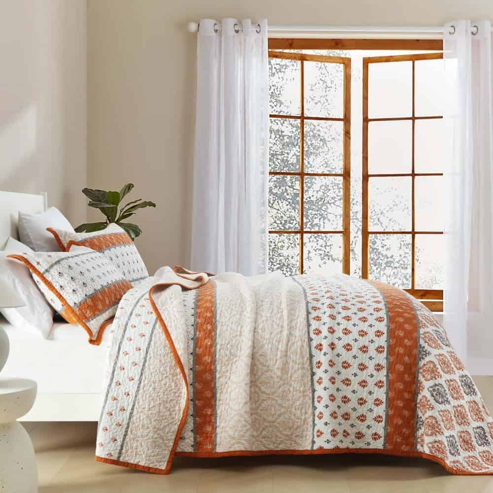 2. Colcha Floral Elegante estampado floral con un vibrante color naranja iluminará toda la habitación. Los detallados bordados mejoran la durabilidad y longevidad.