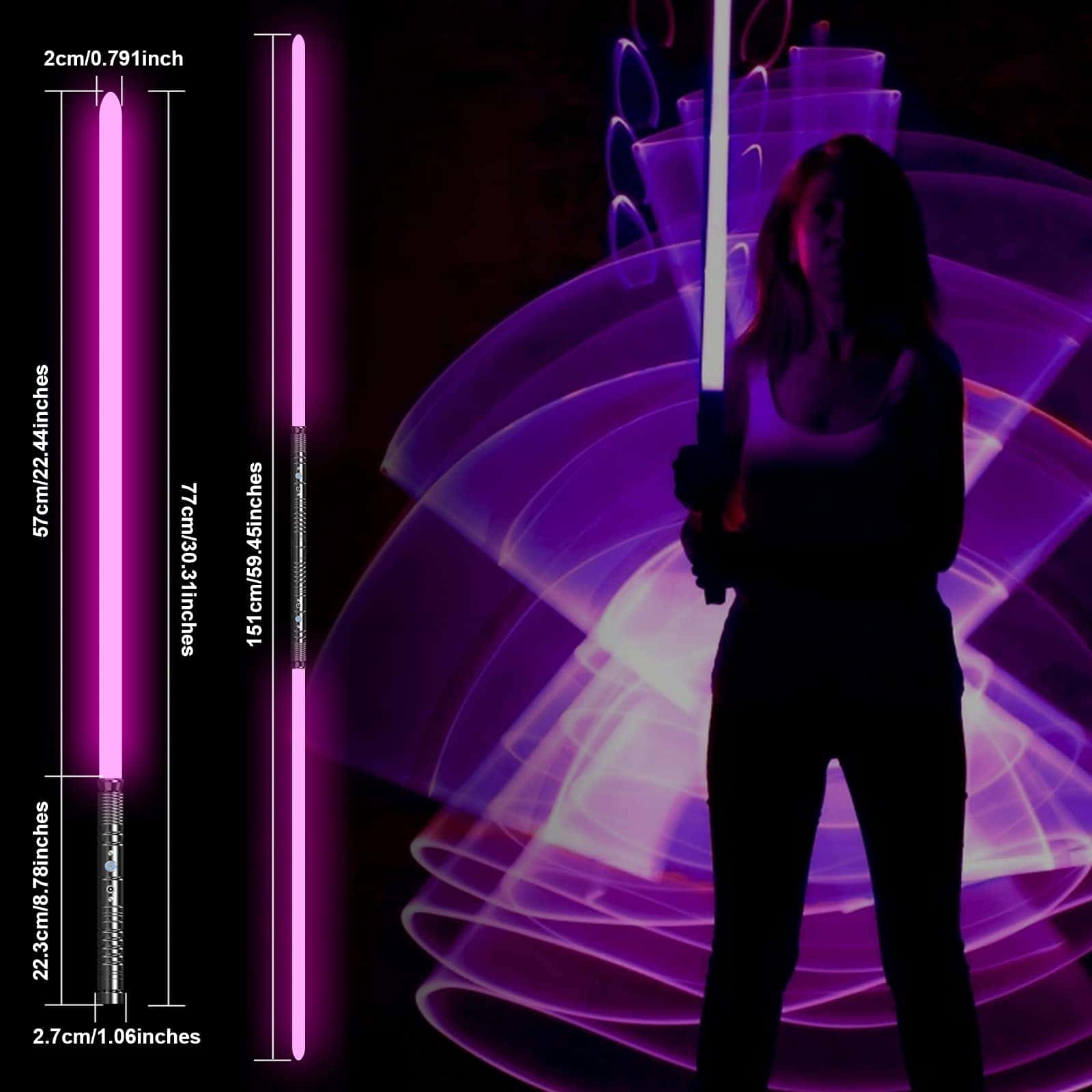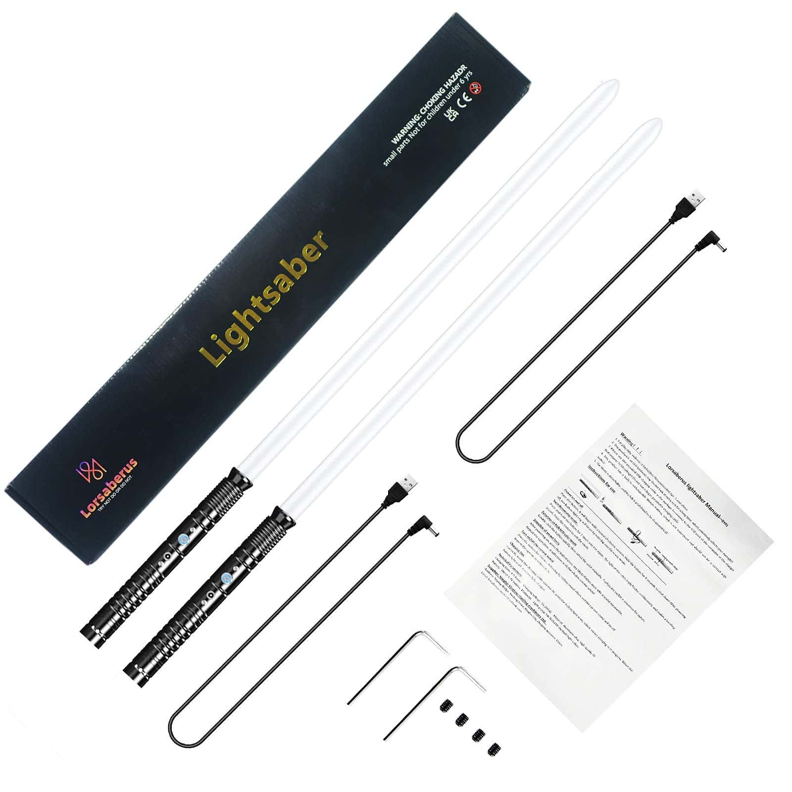 El sable de luz Lorsaberus está equipado con una batería de iones de litio más estable y segura, y se puede cargar rápidamente en 2-3 horas. Ofrecemos una garantía de devolución de dinero de 60 días si no está satisfecho con la calidad de nuestro producto, para que pueda comprar con confianza. (Por favor, utilice un cargador de 5V1A para cargar la batería del sable de luz para evitar daños. El paquete incluye 2 cables de carga USB, 2 sables de luz y 1 manual de producto.). Nuestro mango está construido con una aleación de aluminio de alta calidad y cuenta con tecnología de pulido mejorada para ofrecer un agarre más elegante y cómodo. La hoja está hecha de un material PC duradero y de alto impacto, que es suave y resistente, lo que lo hace adecuado y seguro para que los niños lo usen. El sable de luz individual tiene una longitud total de 30.31 pulgadas, mientras que el sable de luz 2 en 1 mide una longitud total de 59.45 pulgadas. El magnífico sable de luz Lorsaberus es un excelente regalo para niños y adultos por igual. Es fácil de operar, lo que lo hace perfecto para Halloween, fiestas de cosplay, festivales y otros eventos. Cuando enciendas el sable de luz, sentirás que has cruzado al mundo de la película y te has convertido en un guerrero Jedi o Sith en la batalla final. (Se recomienda para edades de 6 años en adelante).