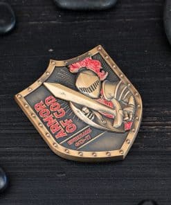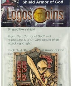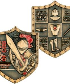 Escudo de Armadura de Dios, Lote de 10 Tokens de Fuerza Caballeresca Estas monedas conmemorativas de alta calidad, bañadas en oro antiguo, son un excelente token para llevar en el bolsillo como recordatorio de que nuestra fuerza proviene de Dios. Lleva uno contigo para tus batallas personales, o entrégaselos a aquellos que necesitan ánimo. Estos Escudos de Armadura de Dios son un gran regalo de fuerza para personal militar, soldados, activos, y veteranos. ¡Nunca te quedes sin tu token de firmeza; nunca olvides de dónde viene tu fuerza! A través de todos los altibajos de la vida debemos recordar protegernos con toda la Armadura de Dios. Esta moneda está destinada a servir como un recordatorio para siempre orar y perseverar mientras nos ponemos toda la Armadura de Dios! Estos medallones de desafío de la Armadura de Dios son una herramienta perfecta para servir como un sutil recordatorio de fe. Ideal para llevar en un bolsillo, bolsa, o mochila para llevar contigo la Alegría del Señor dondequiera que vayas, o ponerlos en exhibición en cualquier mesa o escritorio. Cuidadosamente y exquisitamente diseñada, esta moneda de desafío de versículo bíblico es el regalo o gesto de ánimo perfecto para entregar a amigos o familiares. Haz el día de alguien con un gesto simple y amable y un pequeño regalo. También una gran herramienta para ayudas de enseñanza a granel y lecciones objetivas en la iglesia, la escuela, grupos pequeños, grupos juveniles, y estudios bíblicos. Frente: Un caballero con espada y escudo, con texto, «Armadura de Dios» / «Efesios 6:13-17» Reverso: Iconos de yelmo de caballero, coraza, cinturón, espada y grebas, con texto, «Ponte toda la armadura de Dios Ef 6:13-17» / «Casco de Salvación» / «Coraza de Justicia» / «Espada del Espíritu» / «Cinturón de Verdad» / «Evangelio de Paz para Zapatos» / «Escudo de Fe» Tamaño: 1.75″ x 2″