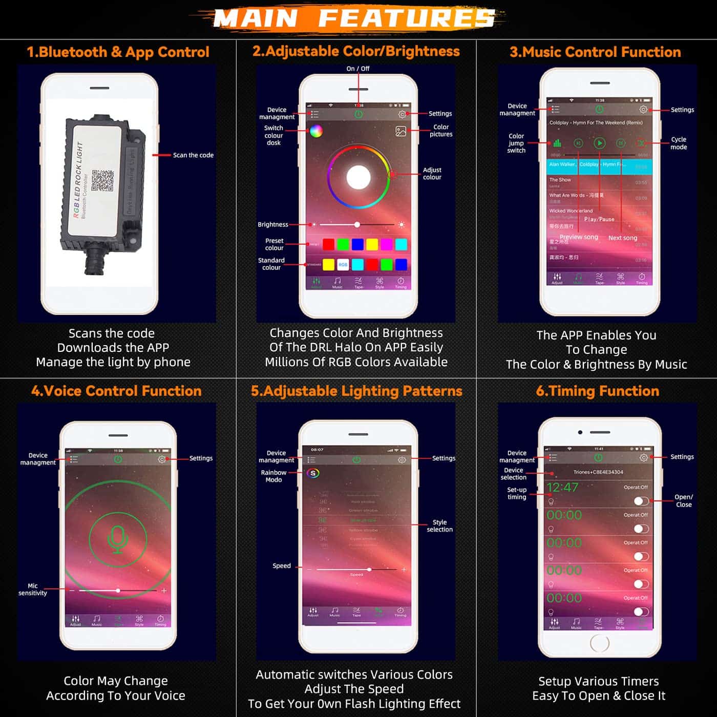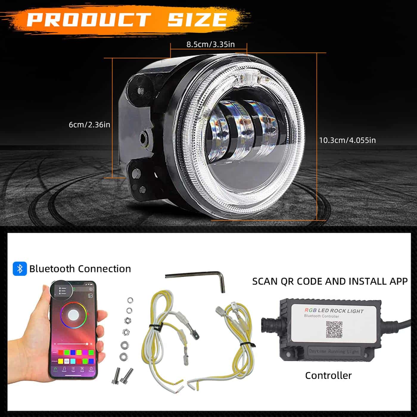 Especificaciones: Fuente: 30W Voltaje de entrada: DC 10-30V Tasa impermeable: IP68 Resistente a los golpes 6000K White Fog Light & RGB Color (Múltiples colores disponibles) Características: 100% nuevo en caja. Las luces antiniebla no solo le dan a su vehículo un aspecto sobresaliente, sino que también proporcionan una salida de luz más brillante que las luces halógenas ordinarias en días lluviosos o neblinosos Hasta 50000 horas de vida útil. La última DRL RGB le permite personalizar su propio color con los dedos y obtener un aspecto realmente único en la multitud. DRL mejora la visibilidad de su vehículo durante el día y en condiciones climáticas adversas Hecho de materiales comparativos OE para garantizar un rendimiento óptimo y durabilidad. Certificaciones CE, RoHS.