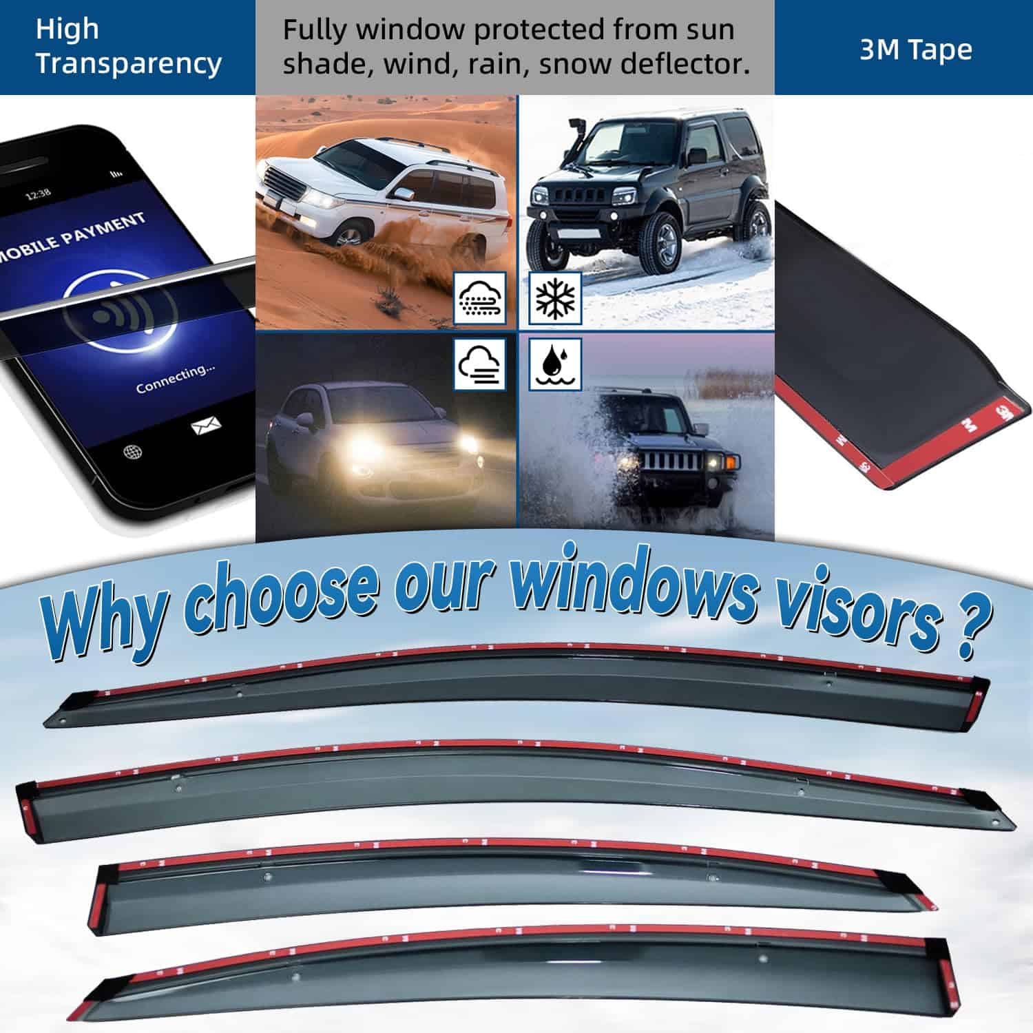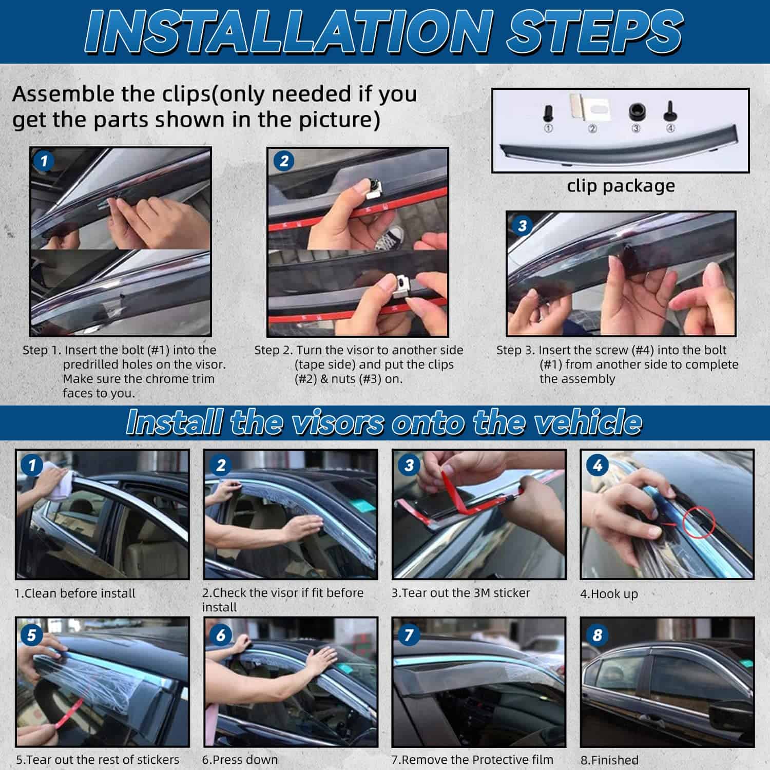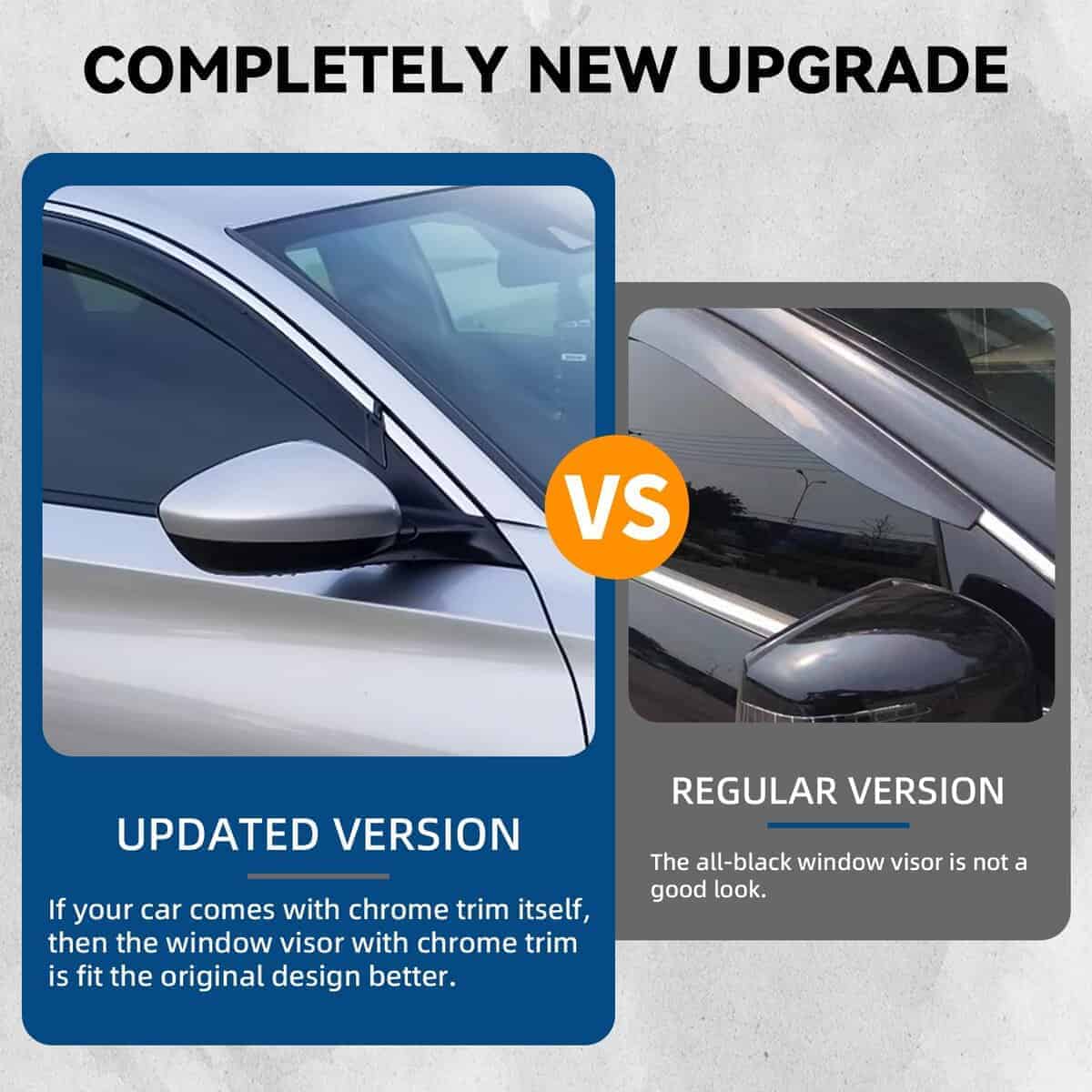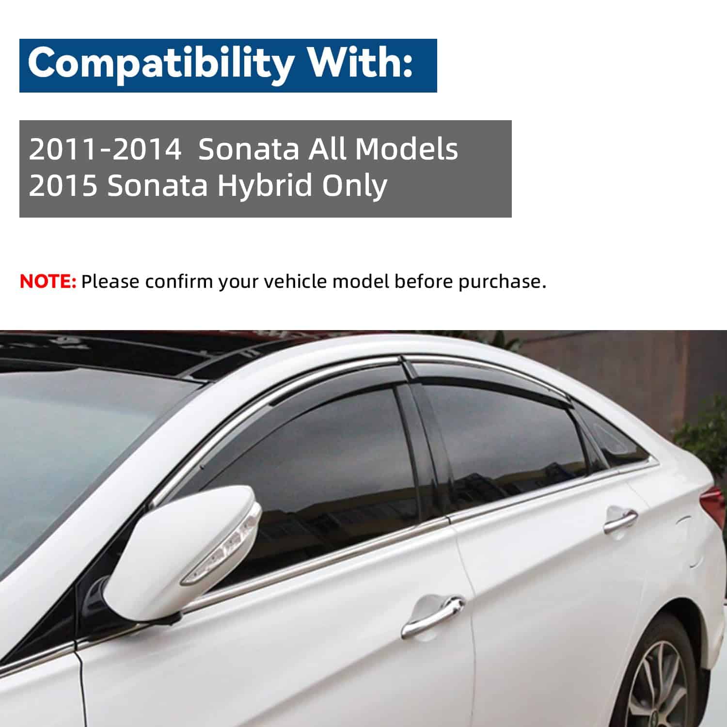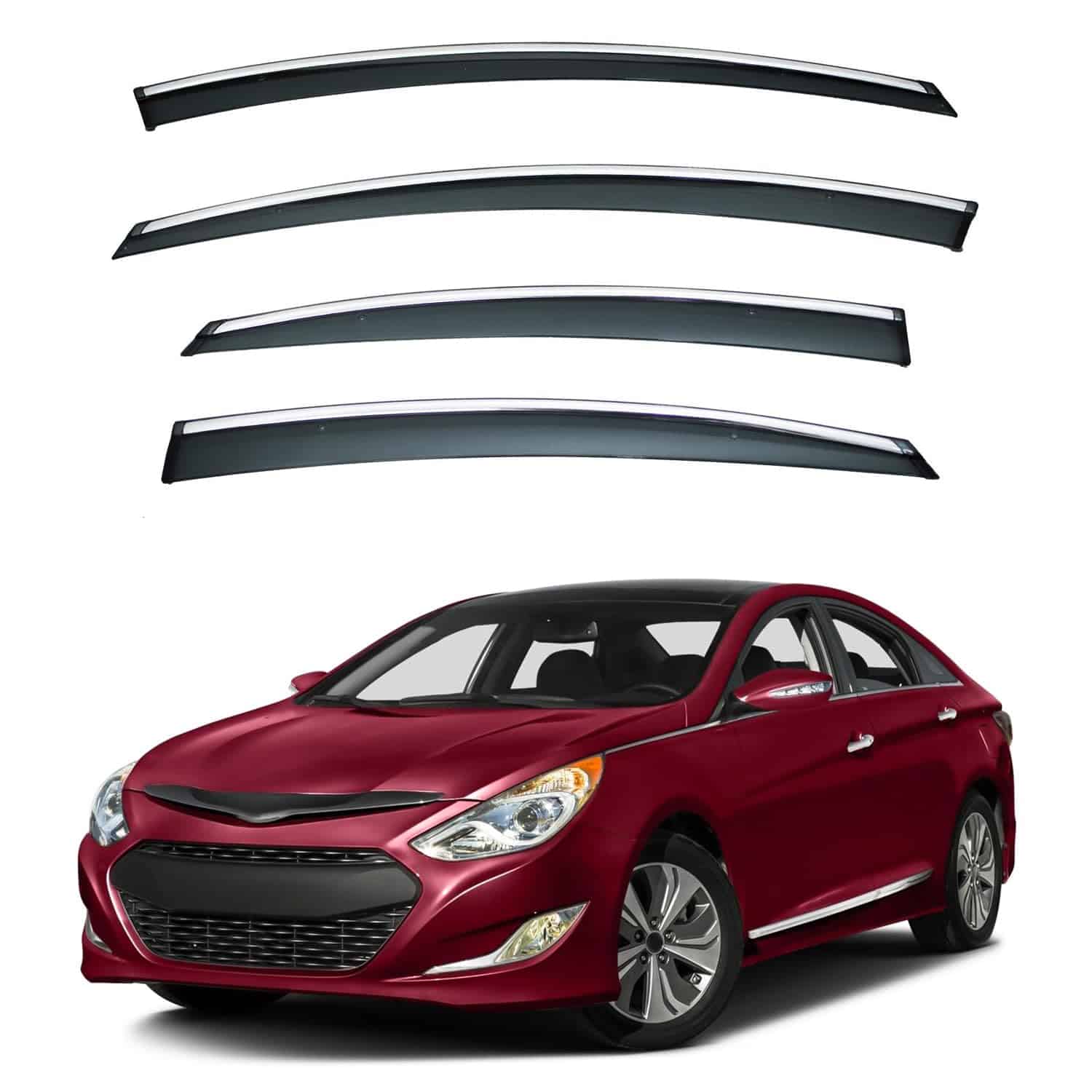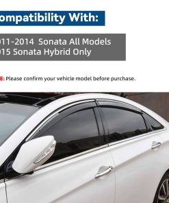 LQQDP 4 piezas Humo Tintado con Ribete Cromado Estilo de Montaje Exterior con Cinta/Clip en PVC Guardia de Lluvia de Sol Visera de Ventana Compatible con Sonata i45 YF 11-14 Sonata 15 Híbrido. El juego de viseras de ventana de LQQDP está diseñado para adaptarse a los modelos Hyundai Sonata 2011-2014 y al Hyundai Sonata Hybrid 2015 únicamente. Las 4 piezas de viseras tintadas de humo con ribete cromado no solo añaden un toque de estilo a su vehículo, sino que también proporcionan funcionalidad al reducir el ruido del viento y proteger de la lluvia y el sol. El estilo de montaje exterior de estas viseras (no en el canal) garantiza una instalación fácil y segura con cinta 3M y clips incluidos, sin necesidad de cortar ni perforar. Fabricado en PVC y con un proceso de moldeo por inyección que asegura resistencia pesada y un aspecto suave, estas viseras son duraderas y de alta calidad.