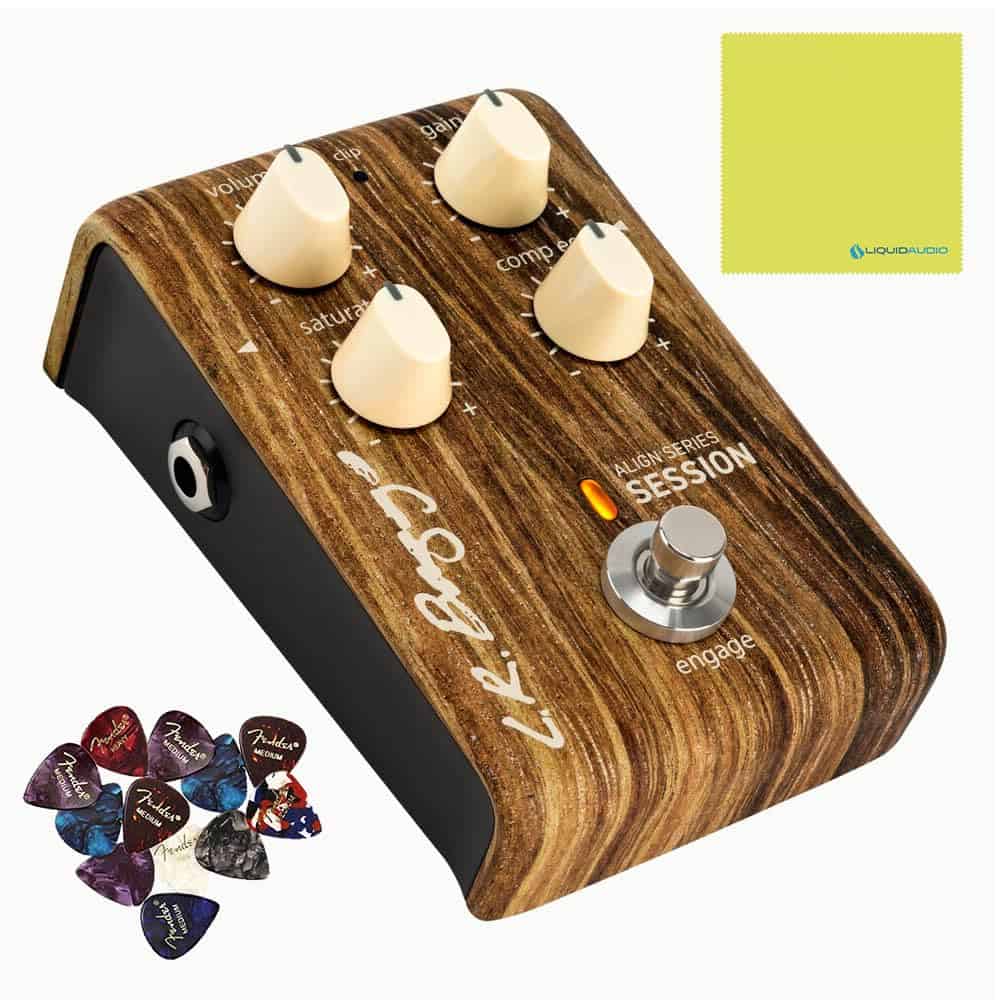 LR Baggs Align Session Pedal Acústico featuring Saturation and Compression es perfecto para músicos que desean llevar el sonido de estudio a sus actuaciones en vivo. Este pedal ofrece una saturación analógica cálida y rica, diseñada específicamente para guitarras acústicas, agregando dimensión y armónicos agradables a tu sonido. Además, el Comp EQ de Session te permite controlar y suavizar las frecuencias problemáticas de tu guitarra, desvelando su verdadera voz. Con una ganancia ajustable que se adapta a pastillas pasivas y activas, puedes encontrar el equilibrio perfecto entre saturación y compresión. El diseño conveniente y flexible del pedal te permite elegir entre varios modos de alimentación y funciones, asegurando una integración fácil en tu configuración. Además, este bundle incluye 12 púas de alta calidad de Fender en colores variados para adaptarse a tus preferencias de juego, así como un paño de pulido Liquid Audio para mantener tu guitarra en óptimas condiciones. Añade el pedal Align Session a tu equipo y mejora tu sonido acústico en vivo con calidad de estudio.