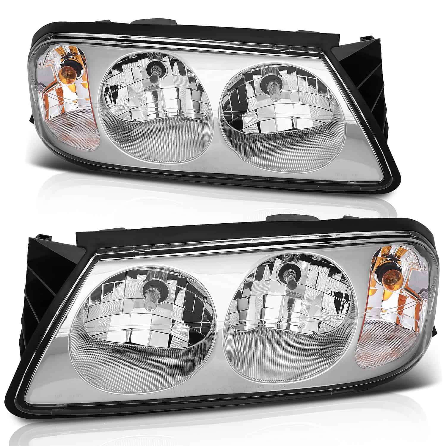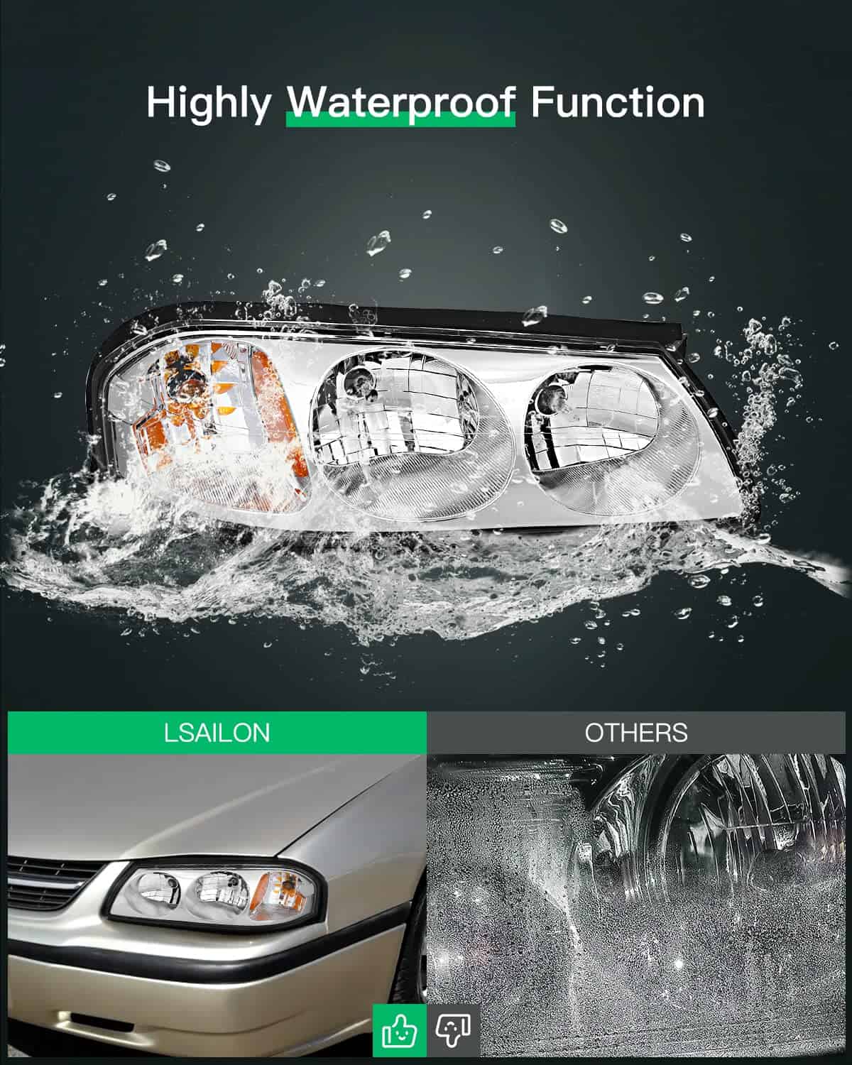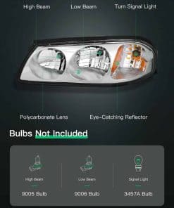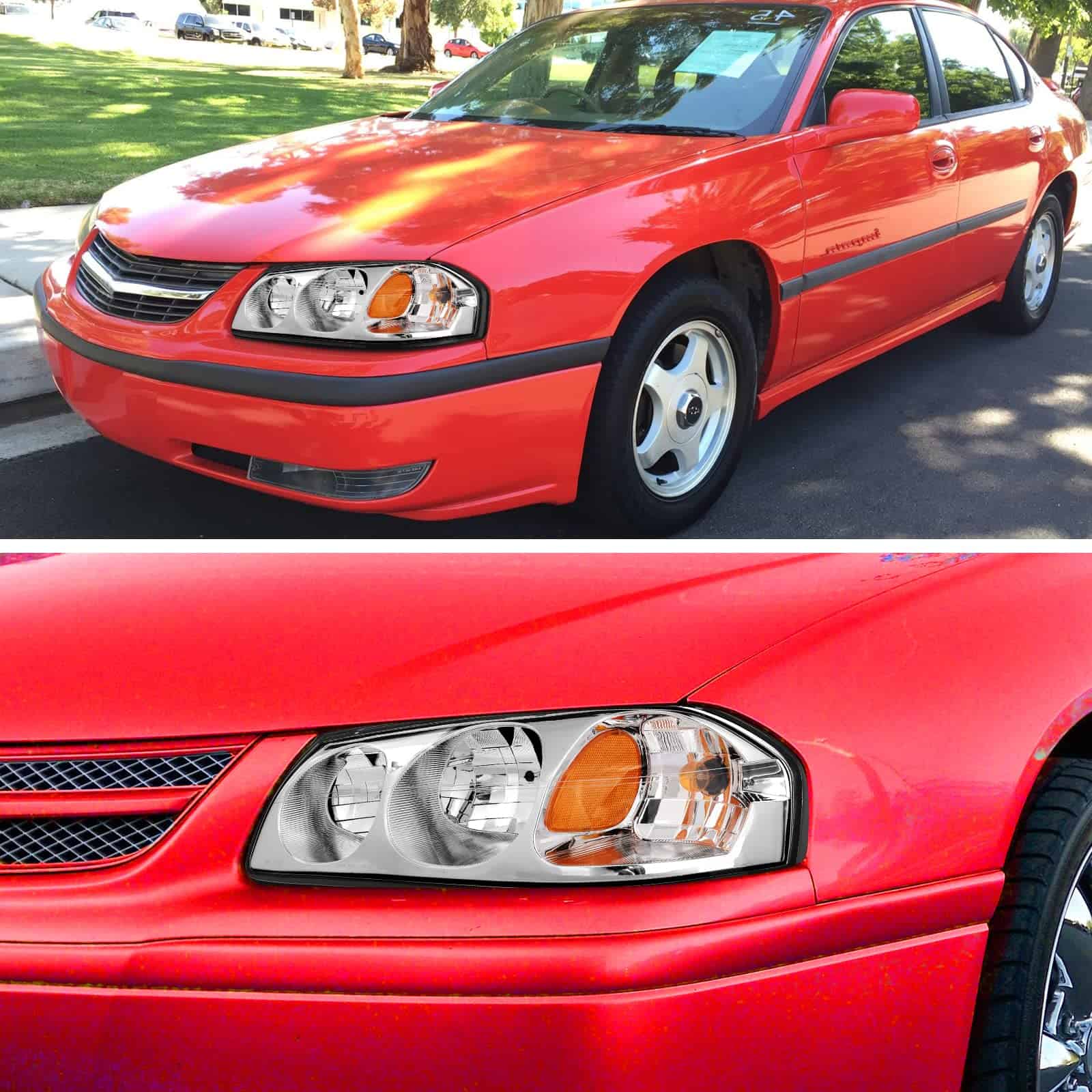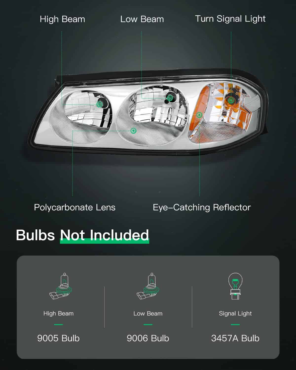 1. Compatible con – Faros de carcasa cromada Reflector ámbar Lente transparente para Chevrolet Impala 4 puertas 2000 2001 2002 2003 2004 2005 OEM: 10349961 10349960.