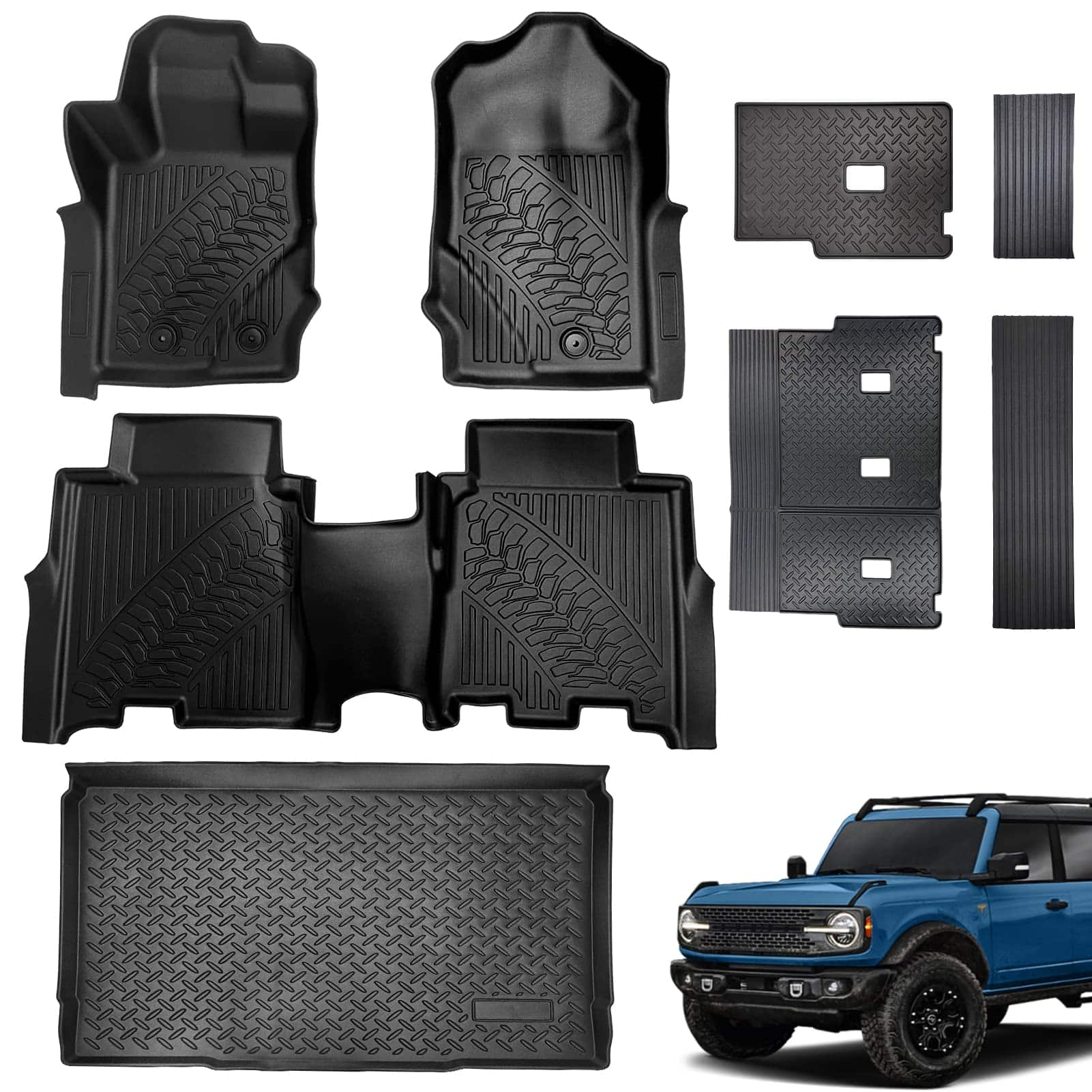 Compatible para Ford Bronco 2021.2022.2023 4 Puertas Offroad. Hazte con los mejores Accesorios OEM para tu vehículo. Este tapete para piso se adapta perfectamente a tu Ford Bronco, gracias a su diseño en 3D y su material de TPV 100%. Hecho con material TPV no tóxico sin olor de alta densidad, este tapete está construido para resistir todas las condiciones climáticas (lluvia, niebla, nieve, etc.). Resistente y flexible en climas fríos o calurosos. No se romperá, deformará, deteriorará ni endurecerá bajo temperaturas extremas.