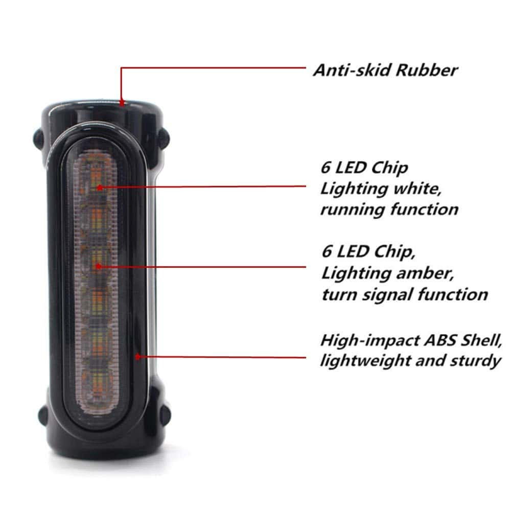 3. Función Conmutable: Con 6 piezas de chips LED de 1 vatio, estas luces de barra de carretera brillarán como ninguna otra. Cada chip LED es de doble color para la función de intermitente; un agradable blanco puro para las luces de conducción y un brillante ámbar para sus luces de giro. Cuando activas tu luz de giro, las luces de conducción en el lado correspondiente se apagarán completamente entre los ciclos de ámbar para una visibilidad máxima;.