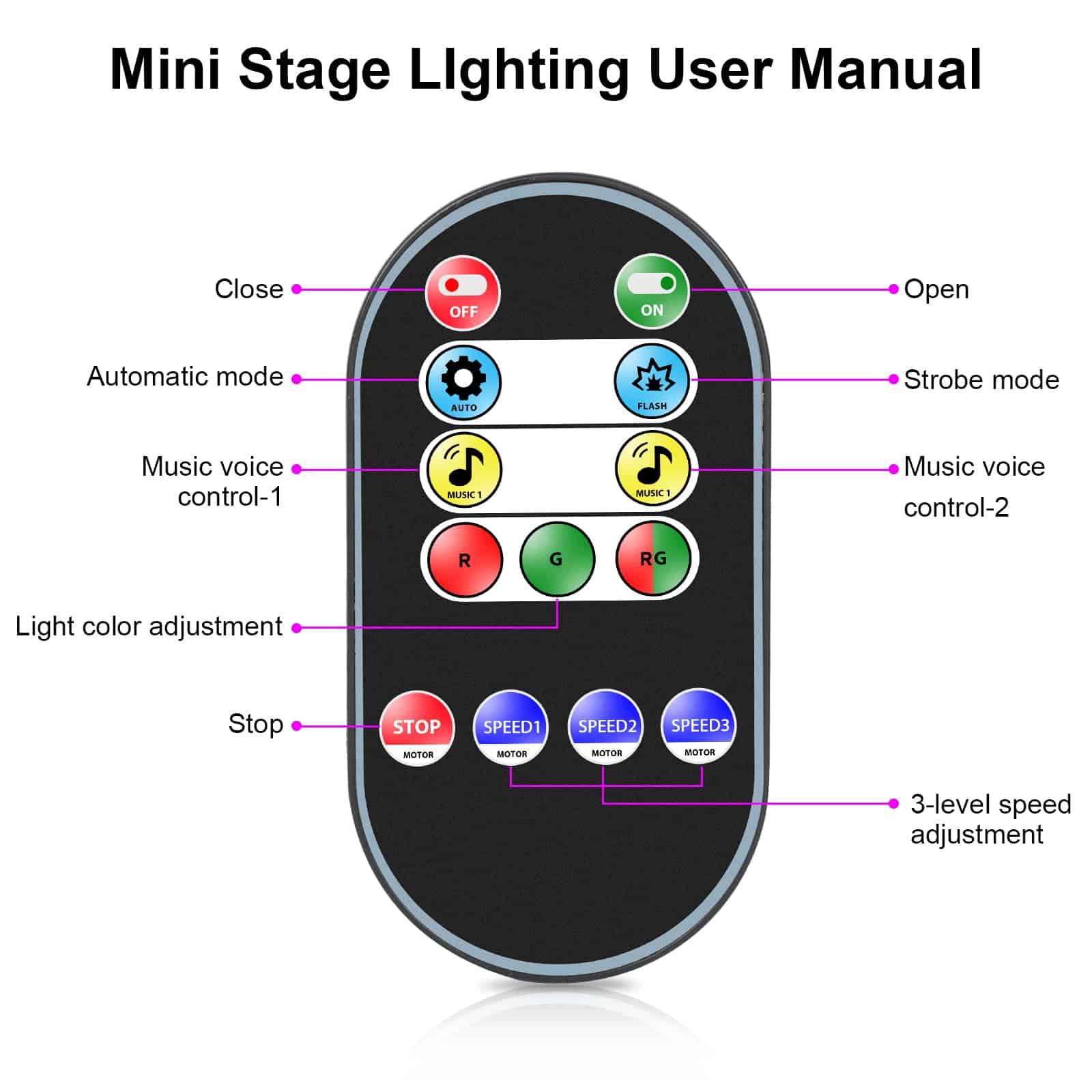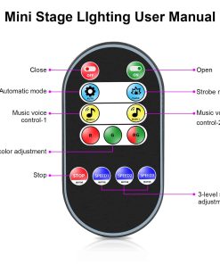 3. Control Remoto: El control remoto puede ajustar encendido / apagado, la velocidad del motor, colores y colores de fondo, cambiar 3 modos de trabajo: Automático (los colores de la luz cambian automáticamente, creando una atmósfera romántica y relajada), Estroboscópico (los colores aparecen y desaparecen rápidamente, creando un efecto de destello), Control de Sonido (los colores de iluminación cambian según el ritmo de la música circundante).