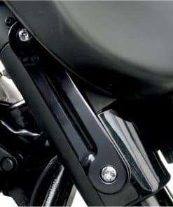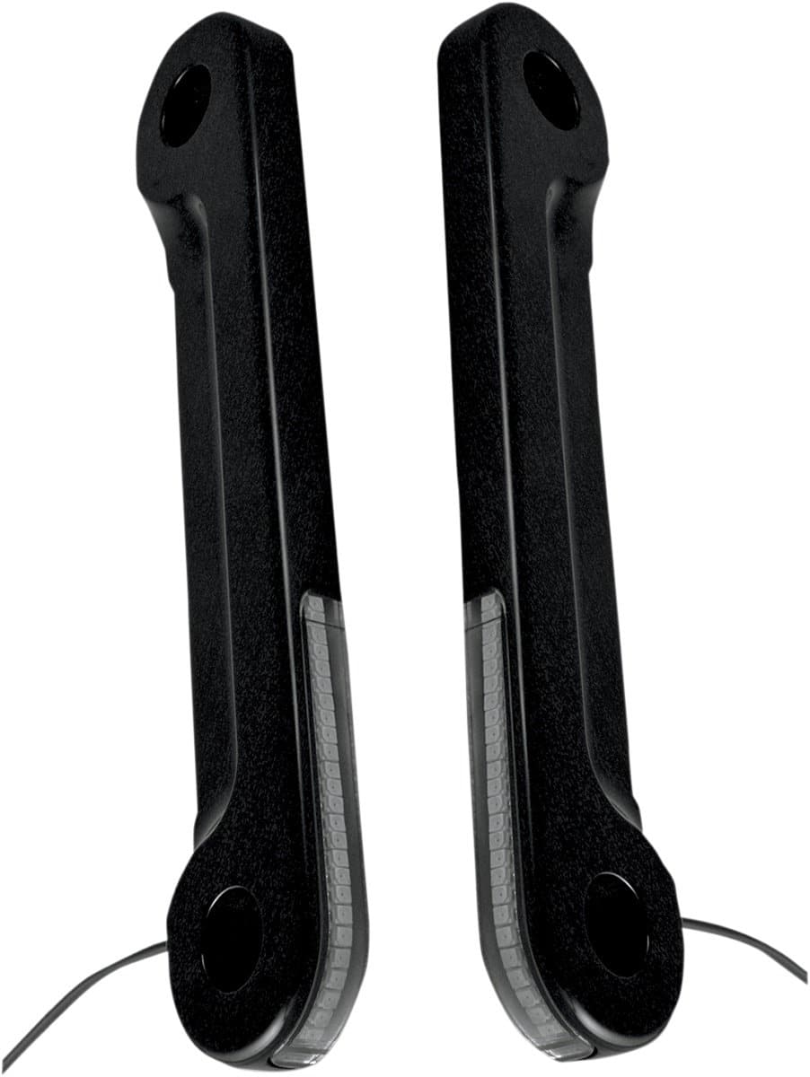 Carcasa de aluminio mecanizado por CNC. Lente ahumada de policarbonato moldeada por inyección. LEDs ámbar super brillantes. Se monta en la horquilla superior de Street Glide, Electra Glide y la mayoría de las carenas de estilo Electra Glide del mercado secundario. No es compatible con lámparas de paso.