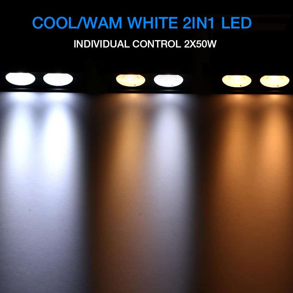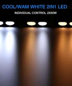 1. Brillante y Alto Índice de Reproducción Cromática (CRI): La nueva luz Blinder viene con potentes leds Cob Cool white y Warm white de 2x50w y temperaturas de color ajustables de 2800 a 6000k. Además, un CRI superior a 90, ofreciendo un efecto lumínico brillante y de gran colorido para cualquier evento.