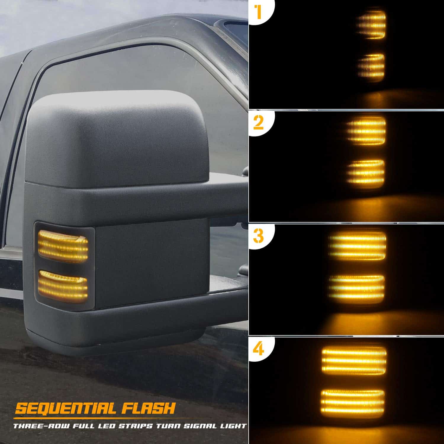 Compatible con 2008 2009 2010 2011 2012 2013 2014 2015 2016 Ford F250 F350 F450 F550 Super Duty con espejos laterales de tipo remolque de fábrica, NO para espejos laterales de posventa. Número de pieza: 7C3Z-13776-A, 7C3Z-13776-B, 7C3Z13776A, 7C3Z13776B. Diseño secuencial y Switchback: Las luces de espejo lateral están diseñadas con 3 filas de tiras LED con interruptores de doble color. Cambie entre luz de estacionamiento / marcha blanca normal y luz de señal de giro ámbar dinámica. Sellado y a prueba de agua: lente de PC de alta calidad y carcasa de plástico ABS procesada con tratamiento ultrasónico, anti-rayado, sin decoloración con exposición prolongada y puede adaptarse a todo tipo de condiciones climáticas extremas.