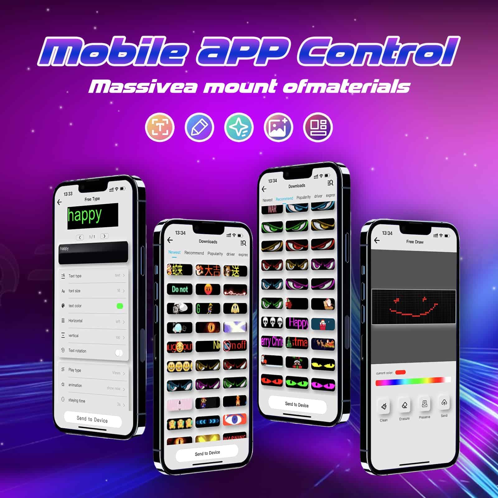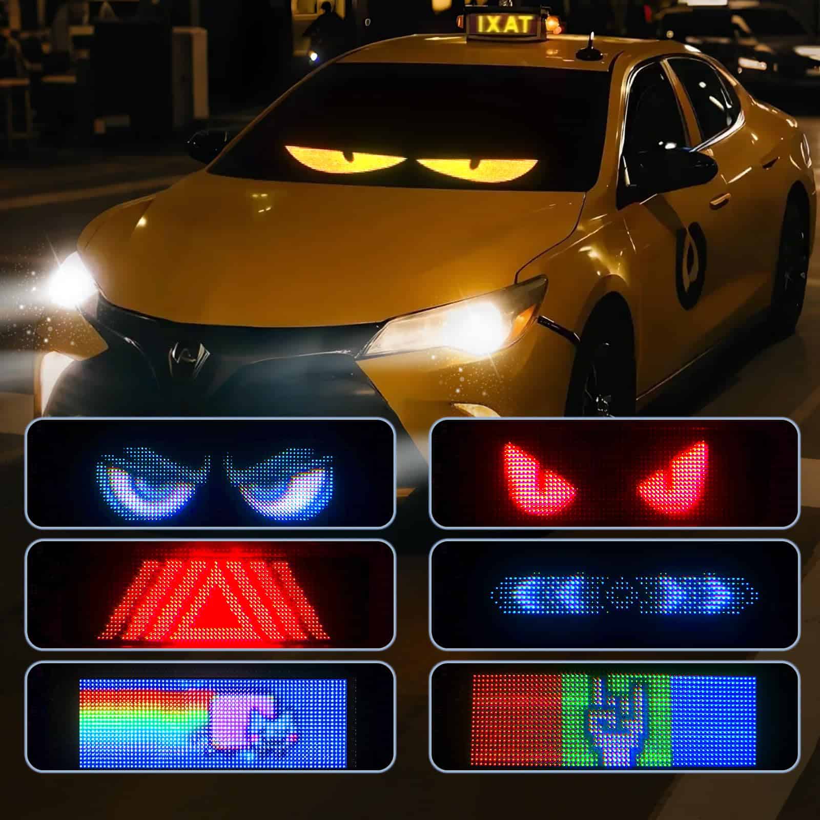 3. Control Remoto + APP, Compatible con 13 Idiomas: La pantalla suave de luz de ojos para ventanas de coche está hecha de pantalla LED flexibles programable. Tamaño de los Ojos de Parabrisas LED: 4.01 x 13.7 pulgadas.