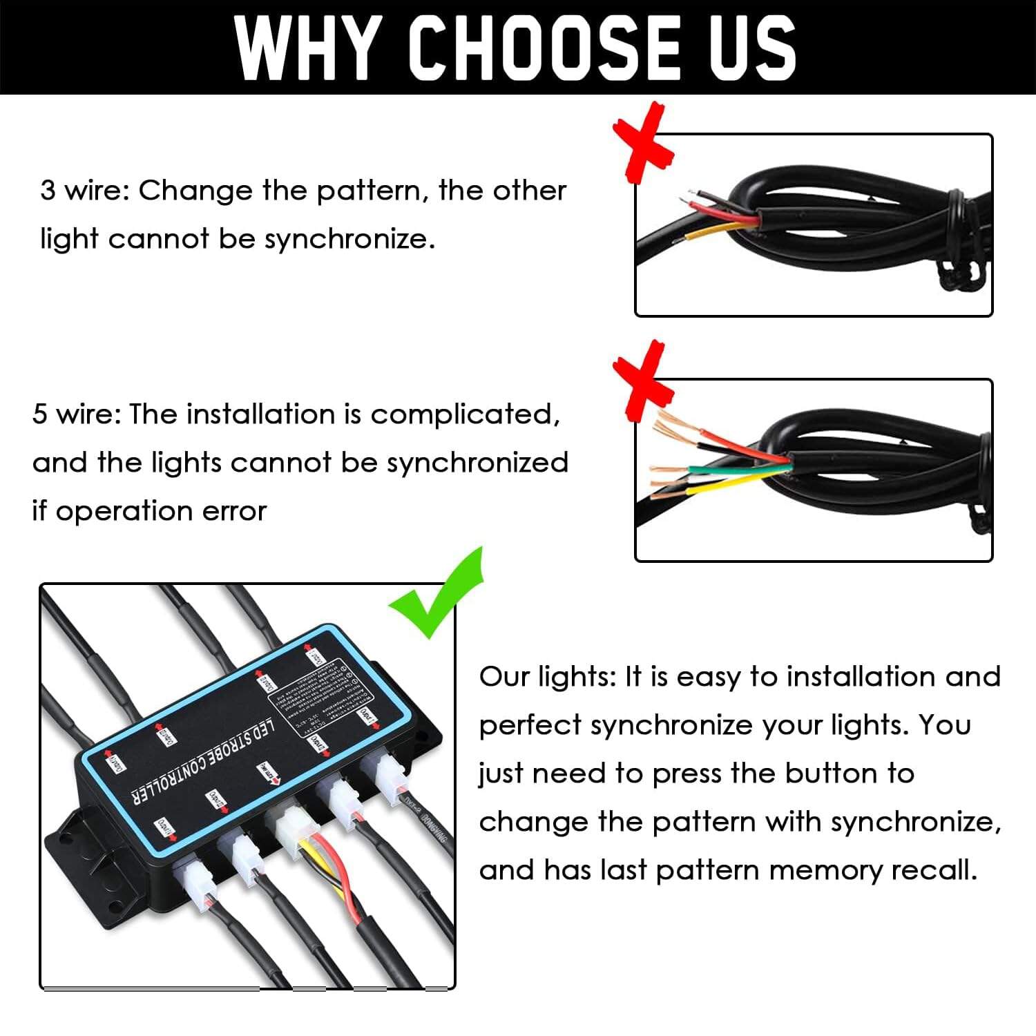 2. Versatilidad e Inteligencia: Este Kit de Luces Estroboscópicas de Emergencia tiene un total de 14 patrones, incluyendo estroboscópico, sincronización, sincronización, aleatorio, alternante y un modo sólido constante, todos controlados por un botón de presión único con interruptor de encendido/apagado. También tiene función de memoria/recuerdo del último patrón utilizado, cuando se enciende de nuevo, funcionará según el último patrón estroboscópico seleccionado. Adecuado para su uso en una variedad de situaciones de emergencia peligrosas.