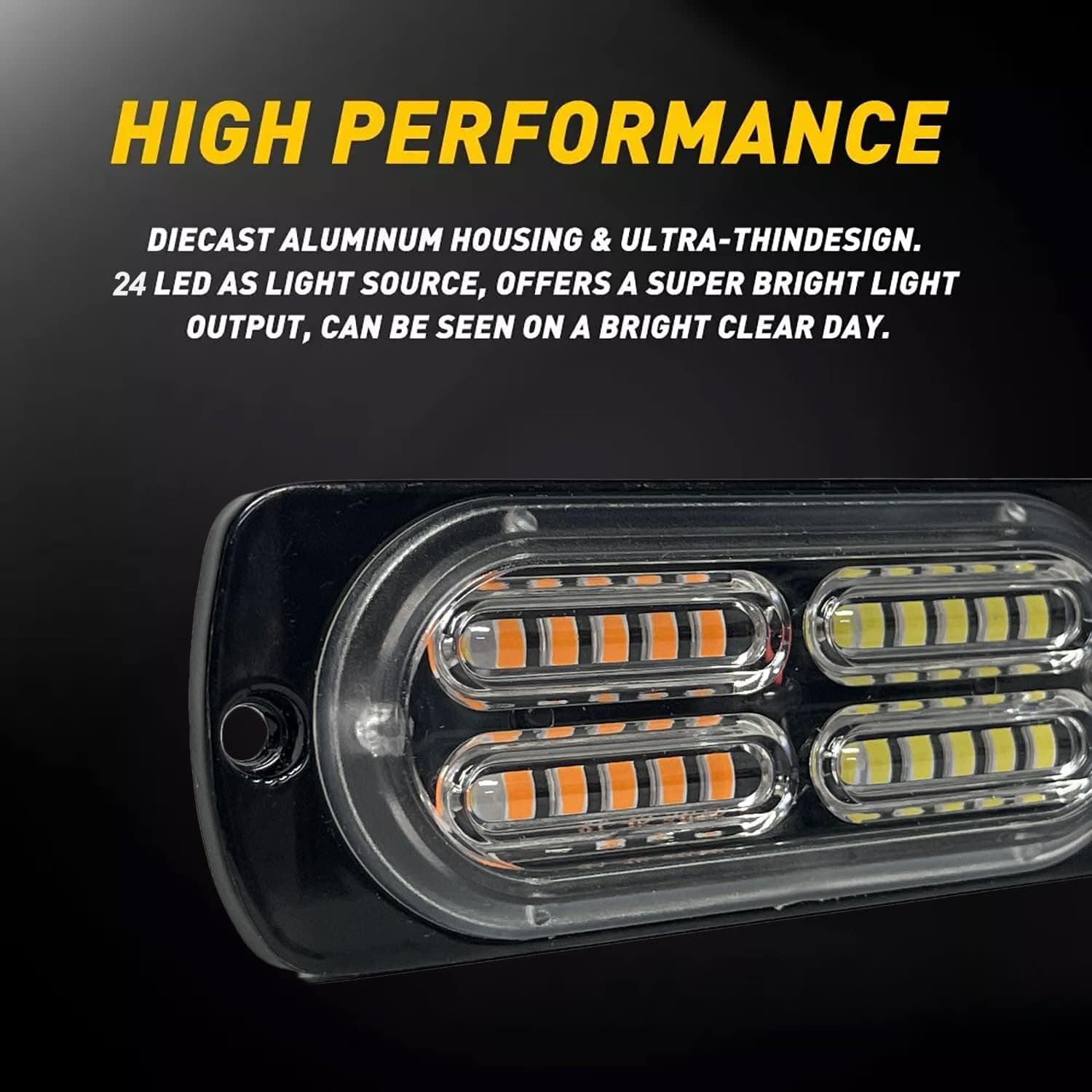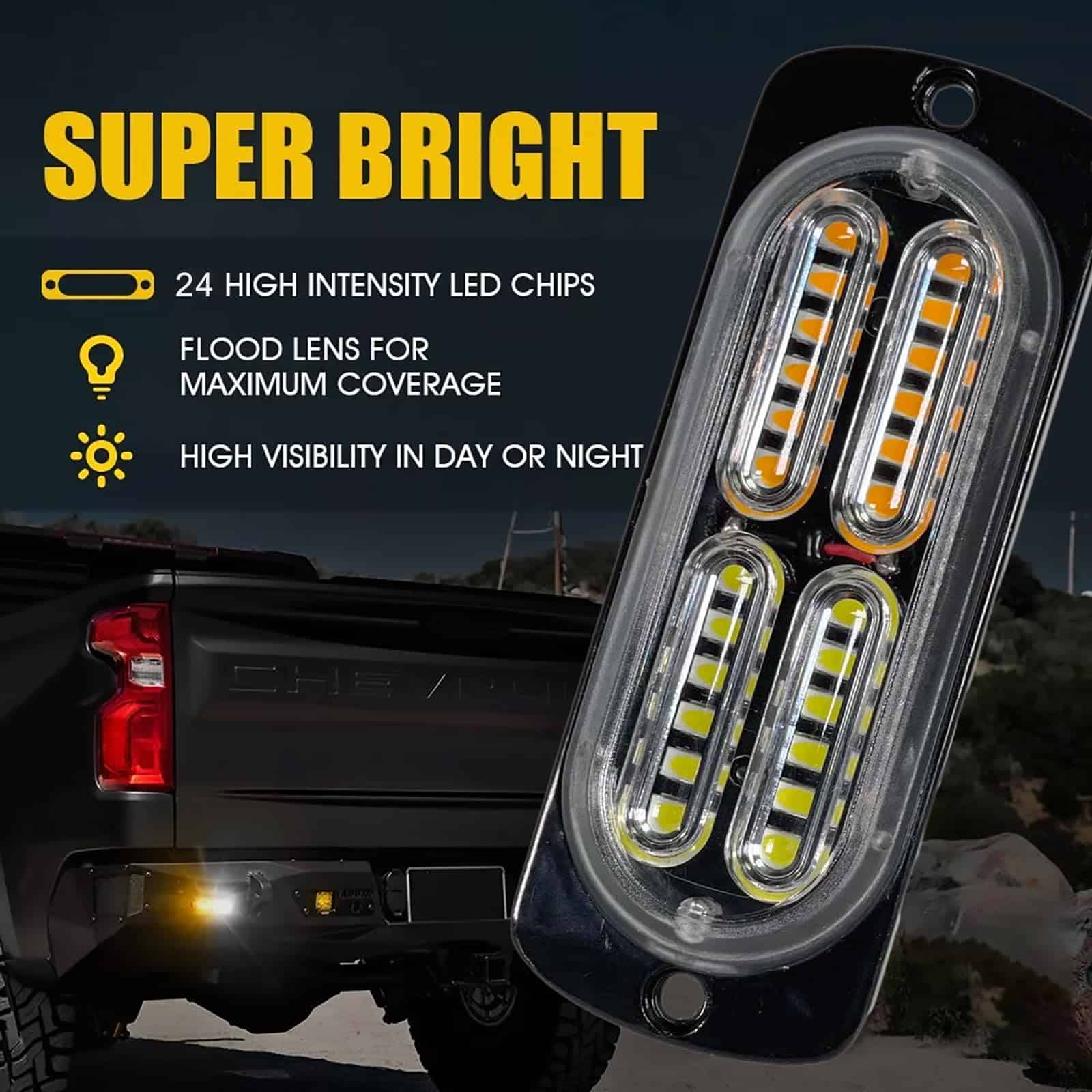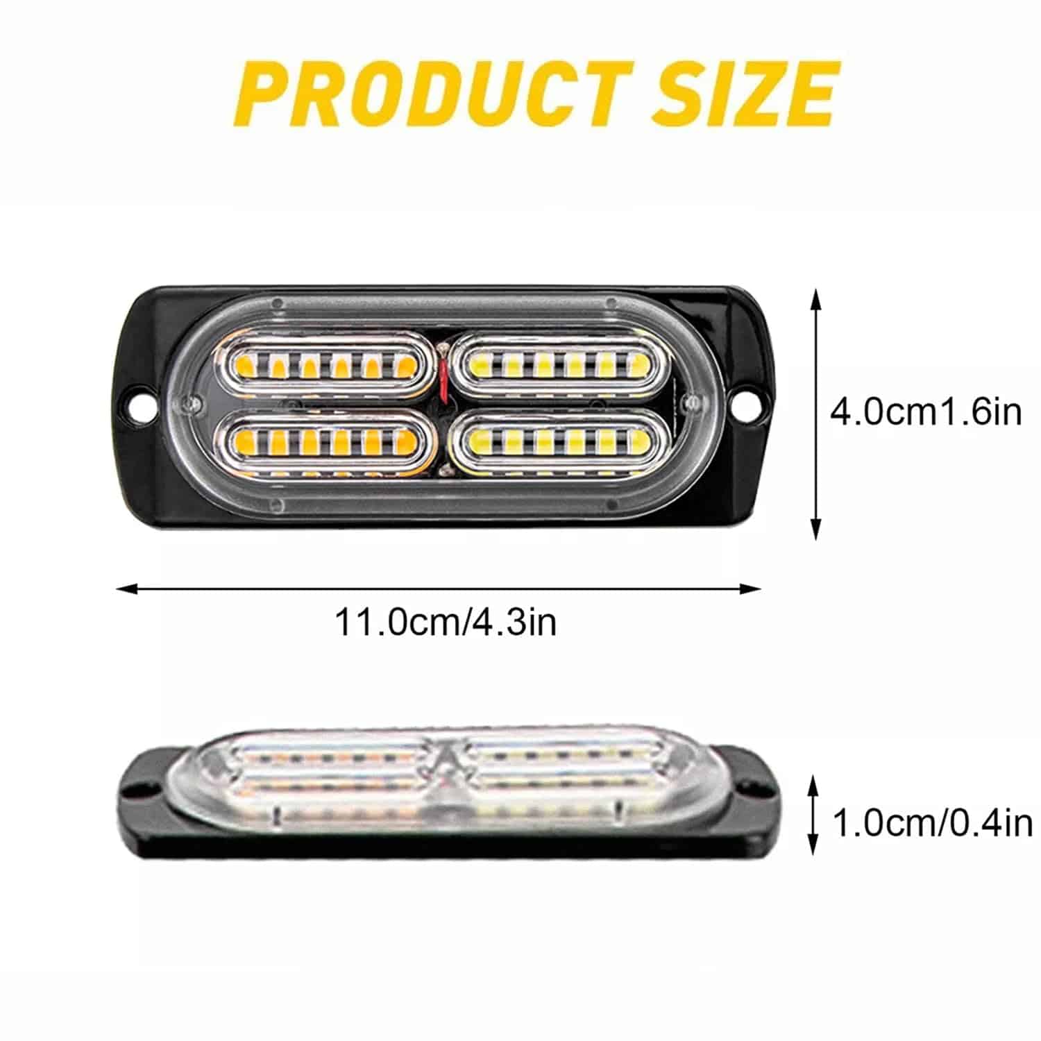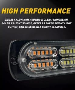 1. Potente Brillo: Barra de luz estroboscópica mini combo de 4 piezas de 12 smd y 4 piezas de 24 smd con chips LED de alta luminosidad ámbar y blancos, súper brillante y penetrante, incluso en fuerte lluvia y niebla o cualquier condición de luz oscura, la potente iluminación y amplio rango de iluminación puede atraer de inmediato la atención a la señal de llamada de ayuda en una emergencia, mejorando la seguridad de situaciones potencialmente peligrosas.