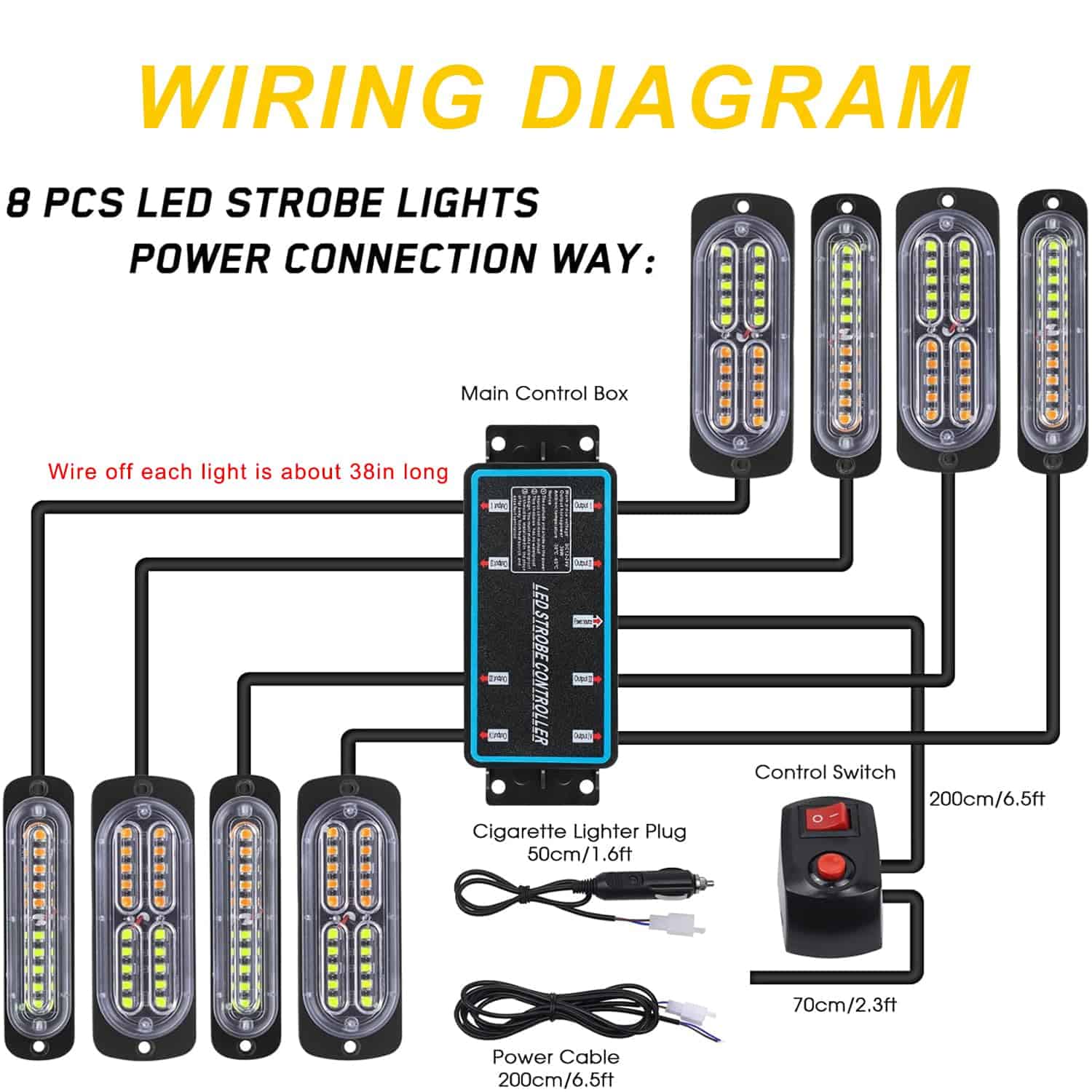 6. Notas importantes: El cableado de este artículo es aplicable solo para la parrilla delantera, NO para el cableado alrededor del automóvil. La longitud de cada luz es de aproximadamente 38 pulgadas.