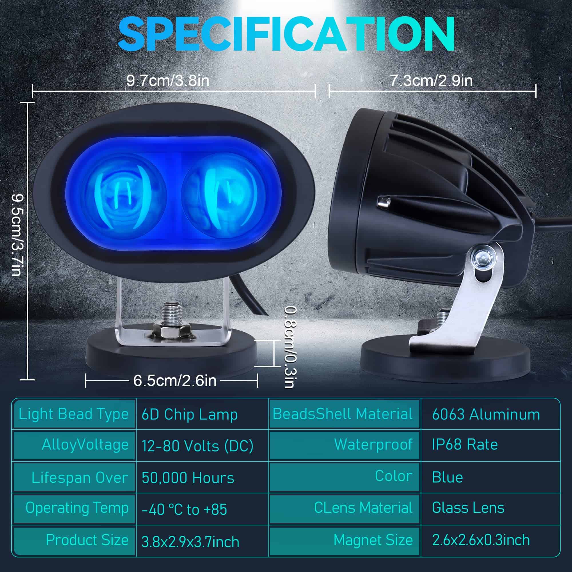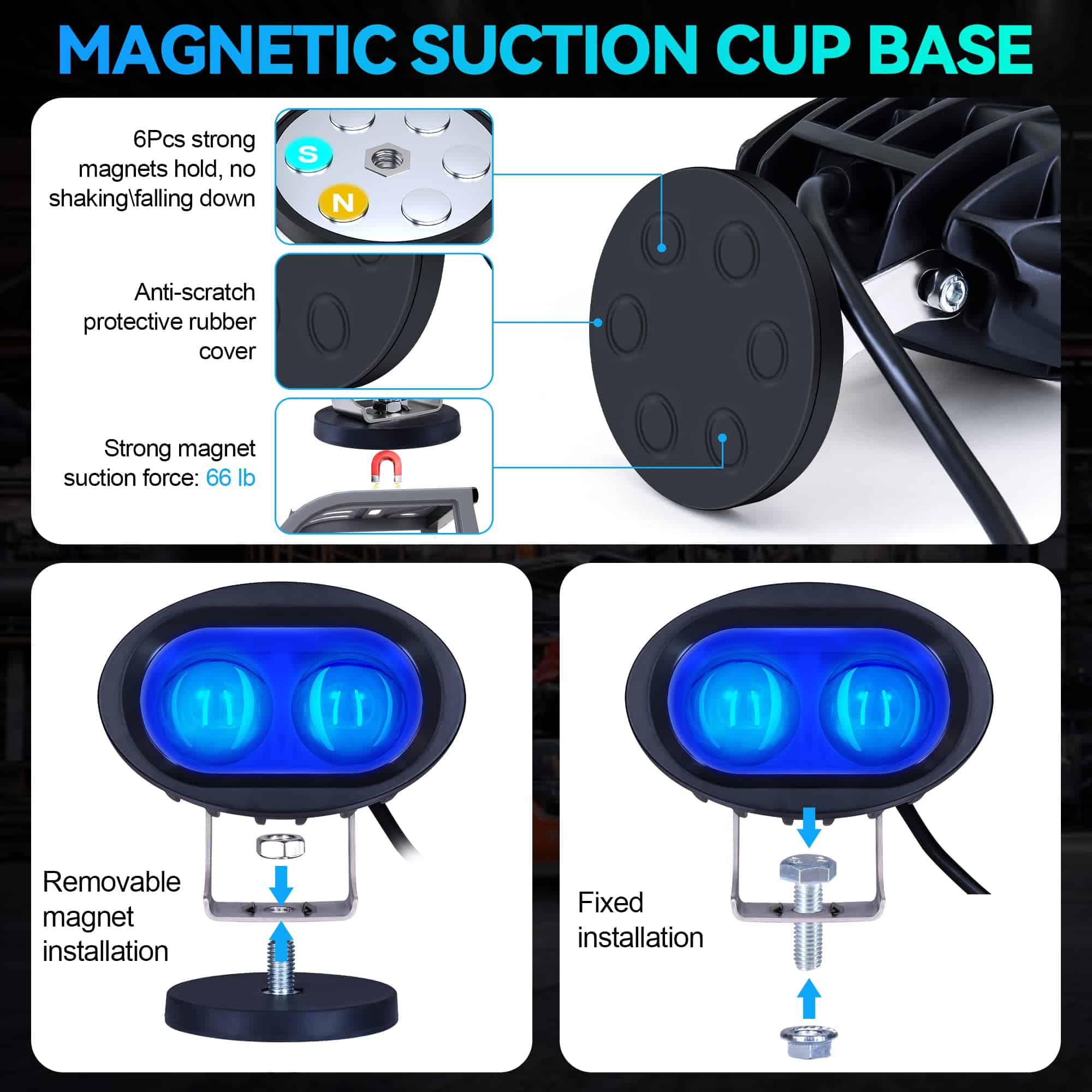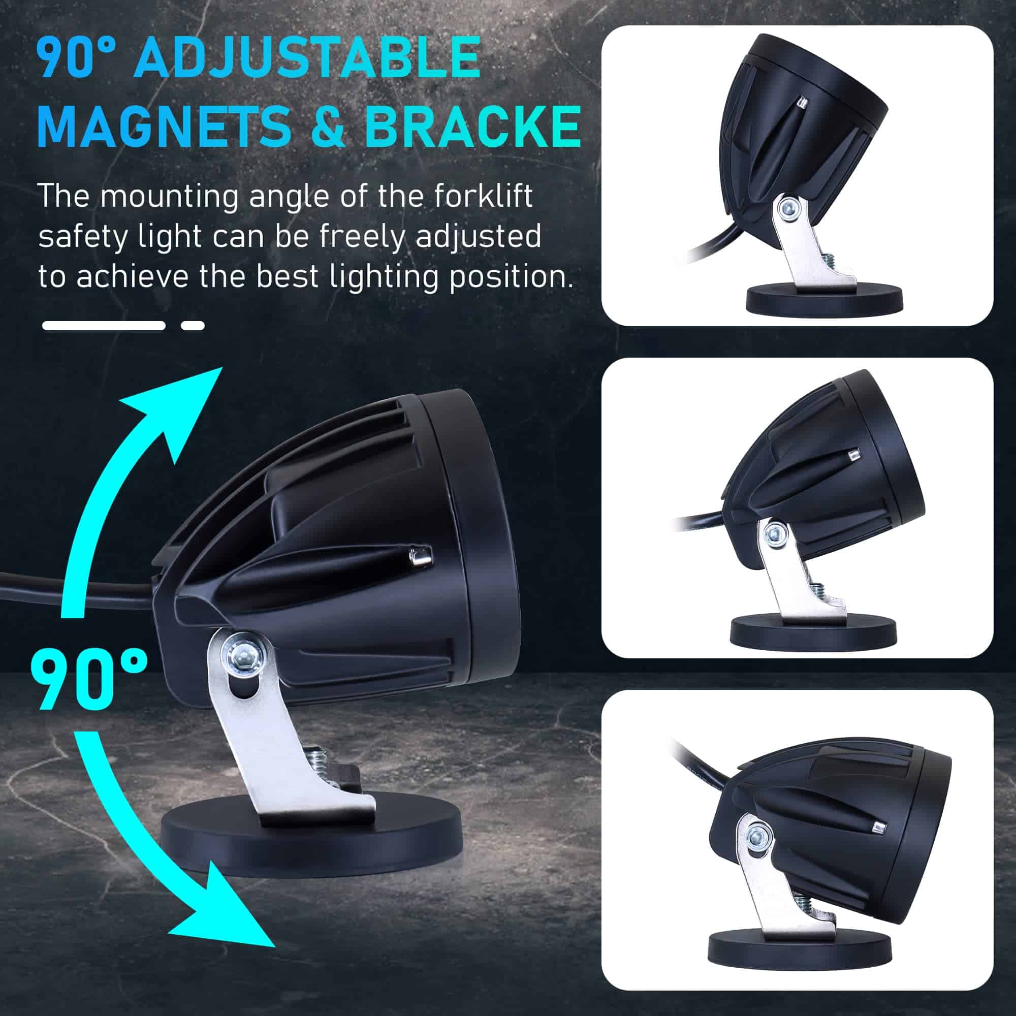 Nueva luz magnética para montacargas: la nueva luz azul magnética para montacargas está hecha con una lente esférica Spotlight personalizada y chips LED de alta calidad importados, diseño óptico innovador de 6D con alta luminosidad, baja generación de calor, alta transmisión de luz y patrón de luz más concentrado que otras luces para montacargas. Montaje ajustable: el soporte de base magnética extremadamente resistente se puede adherir a cualquier superficie metálica para garantizar la estabilidad de alto rendimiento de la luz de trabajo. El soporte de montaje ajustable es fácil de instalar, lo que facilita aún más el cambio de dirección del haz de luz. La funda de goma ayuda a prevenir rayaduras en su montacargas u otras superficies. Diseño de seguridad: se forma un área azul en el suelo; esta área azul se proyecta en la parte trasera de la luz de seguridad azul para montacargas, a unos 3-5 metros. Emite luz para alertar a otros vehículos y peatones que se aproximan para evitar accidentes. Nuestras luces LED para montacargas están diseñadas para la seguridad del montacargas. Disipación de calor eficiente: carcasa de aluminio negro de alta calidad 6063 con un disipador de calor de aluminio grande incorporado puede aumentar el área de disipación de calor y garantizar una rápida disipación de calor. Evite el sobrecalentamiento del cuerpo de la luz y reduzca la temperatura para que el LED dure más y sea más brillante. La vida útil puede superar las 50,000 horas. Súper compacta e impermeable IP68: más ligera y compacta que otras luces de seguridad azules para montacargas, ocupando una pequeña posición de montaje, la luz de marcha atrás se puede utilizar en interiores y exteriores, proporcionando una vista segura en la mayoría de los malos climas (como lluvia, niebla y nieve) Puede hacer frente fácilmente a todo tipo de clima extremo. Le ofrecemos más y mejores opciones.