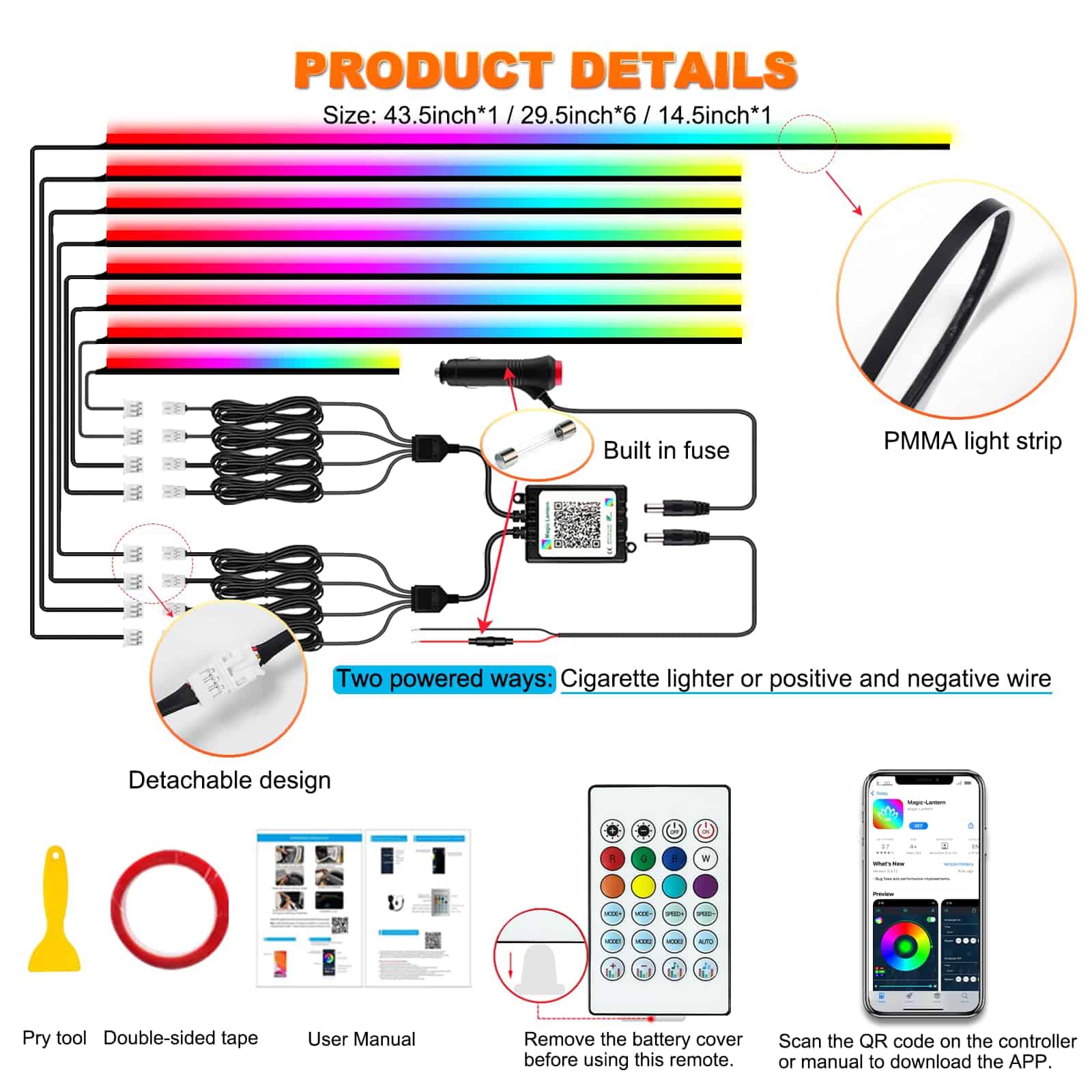 7. Paquete: 1 kit de luces LED de acrílico para coche, 1 control remoto RF, 1 encendedor de cigarros con cable, 1 cable positivo y negativo, 1 cinta adhesiva de doble cara, 1 herramienta de palanca, 1 manual.
