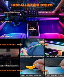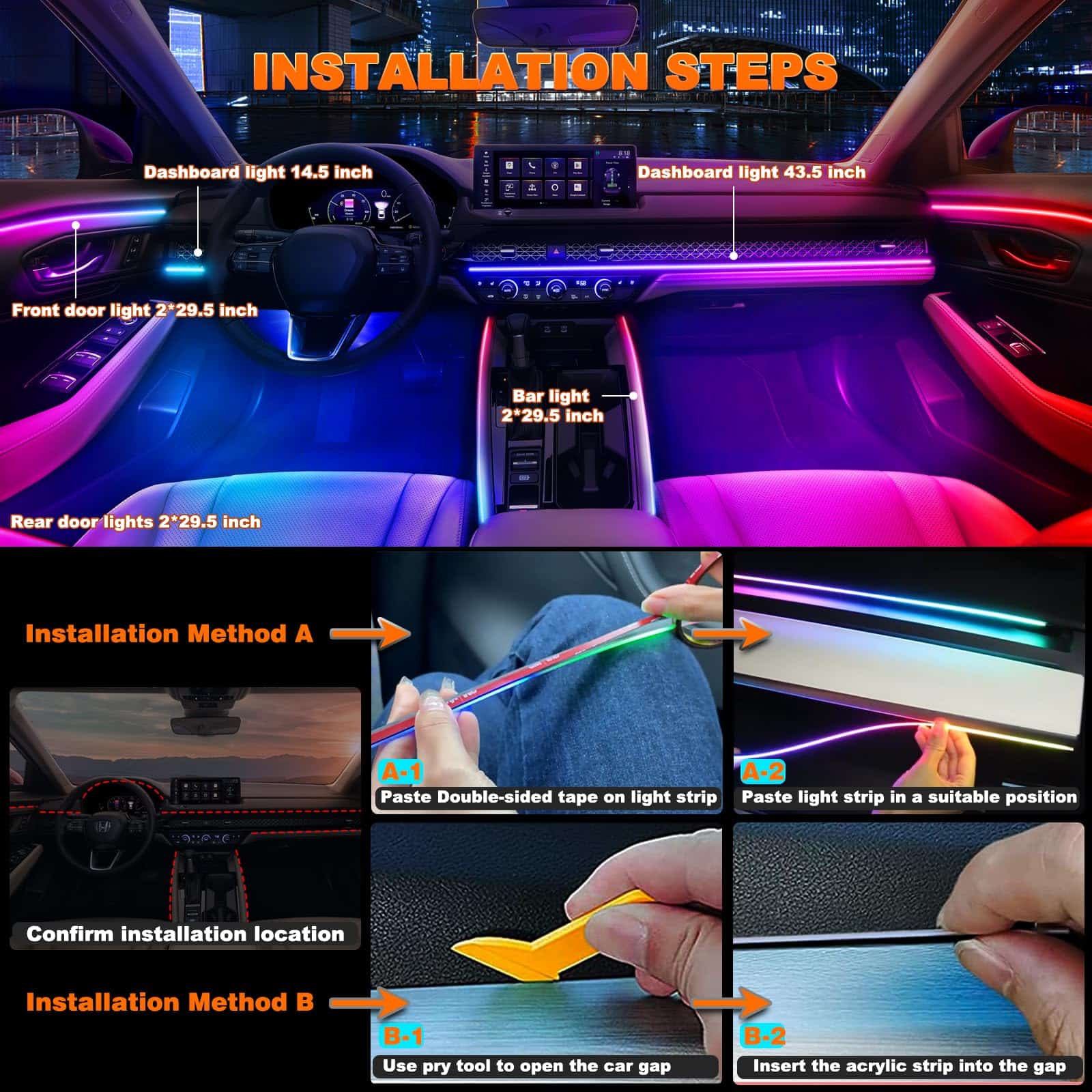 1. Alta luminosidad y uniformidad: en comparación con las luces de fibra óptica, nuestras luces interiores para coche utilizan material acrílico, y la tira de luz está equipada con cientos de LED brillantes para garantizar una iluminación brillante, suave y uniforme. ¡Ya sea de día o de noche, haz que tu coche resalte!