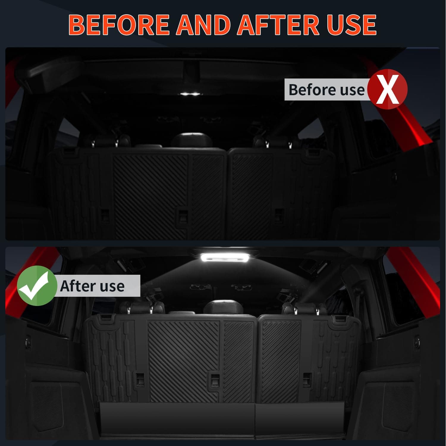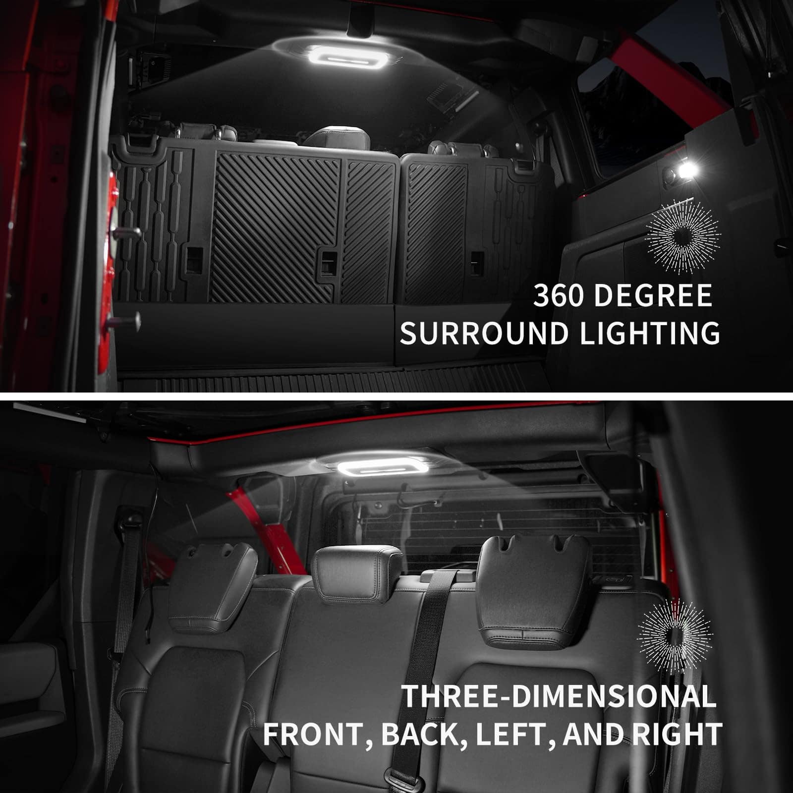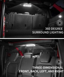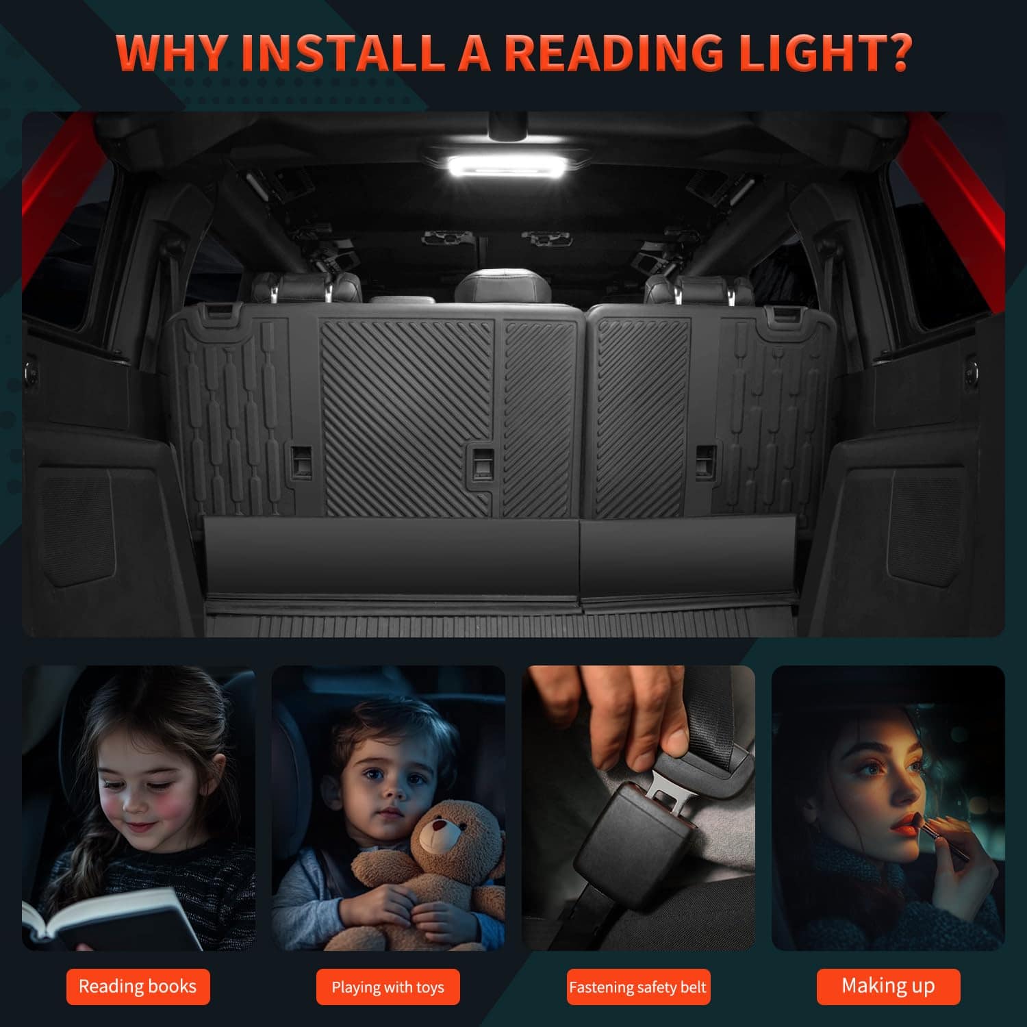 Las luces del techo trasero de Aigmux son compatibles con Ford Bronco 2021-2025 de 2 puertas. Esta luz de techo mejorada proporcionará iluminación brillante y una mayor visibilidad dentro de tu automóvil, iluminando fácilmente todas las áreas desde los asientos delanteros hasta el área de carga del maletero. El ángulo es más amplio en comparación con las luces de lectura tradicionales, lo que la hace ideal para diversas actividades como leer, encontrar cosas, maquillarse, comer bocadillos, e incluso para que los niños jueguen con juguetes de manera más conveniente.