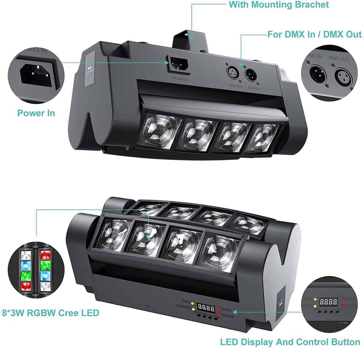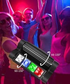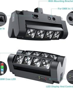 8 Rayos Mágicos Cada luz LED se mueve independientemente con un motor de giro de 60-150 grados, produciendo 8 rayos dinámicos que crean un efecto de persecución cautivador no comparable con una bola de discoteca de baja gama. Efecto de Barrido Dual Rápido Luces de discoteca innovadoras para fiestas en casa con ángulos de movimiento de 60-150 grados, con 4 LED monocromáticos en cada lado de la cabeza móvil. Active las luces de DJ activadas por sonido para su próxima reunión, ¡y seguramente impresionará a la familia y amigos. Luces Giratorias de DJ de 4 Modos Esta luz de escenario de cabeza móvil ofrece 4 modos versátiles: 1. Modo Automático, 2. Activado por Sonido (micrófono HD incorporado sincroniza los efectos de luz con la música; ajuste la sensibilidad si es necesario), 3. Maestro-Esclavo (sincronice varias luces) y 4. DMX512. Estas luces de discoteca multifuncionales ofrecen impresionantes efectos de iluminación de escenario. Uso Versátil Esta luz de discoteca de cabeza móvil profesional es una excelente opción para elevar la ambientación en fiestas, bares, clubes, cumpleaños, bodas, vacaciones, eventos, espectáculos en vivo y celebraciones de Navidad/Halloween. ¡Una potente luz de cabeza móvil de araña obtenga su set hoy! Configuración sin Problemas Esta cabeza de luz de DJ de araña cuenta con 8 LED monocromáticos RGBW 3W, un panel de control de 4 botones, un rango efectivo de 5 metros, 7/13 canales DMX y una vida útil de 5,000-10,000 horas. Incluye un soporte para colocarlo de forma flexible en el suelo, barra en T, truss en T, techo o cualquier ubicación deseada ¡un valor increíble para la iluminación de DJ de nivel profesional!
