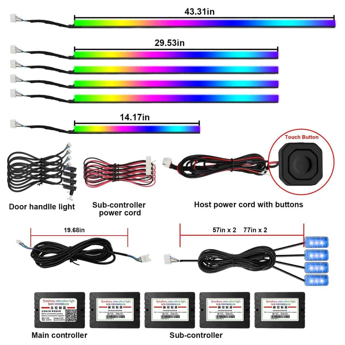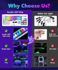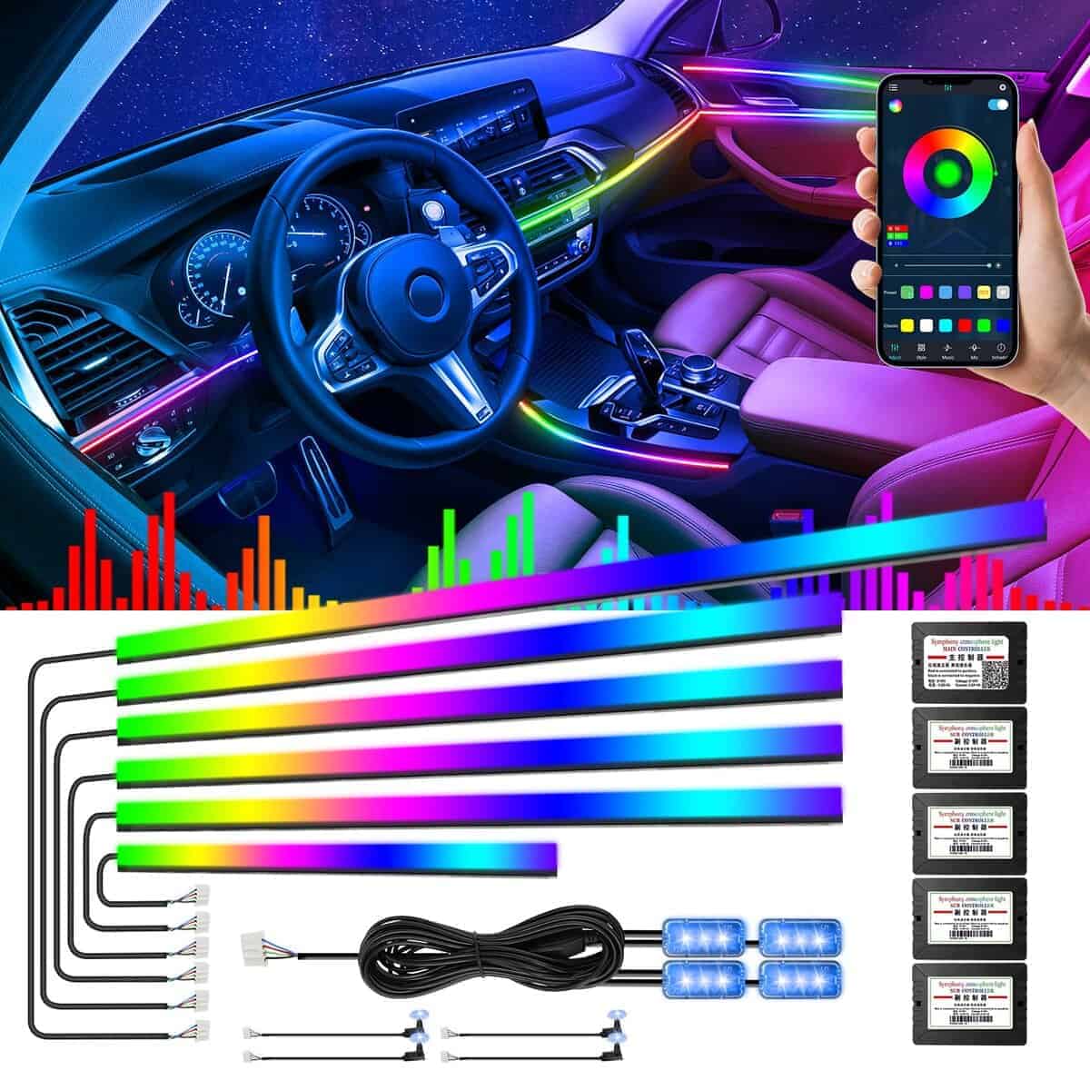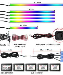 Luces LED para automóvil de AMKI que incluyen 6 tiras de luz de fibra óptica acrílica (1 de 14 pulgadas + 4 de 29.5 pulgadas + 1 de 43 pulgadas, con 593 LEDs), 4 luces debajo del tablero, 4 luces de manija de puerta, un controlador principal y 4 controladores esclavos, todas las herramientas de instalación requeridas están incluidas, fácil de instalar, sin tener que preocuparse por el cableado expuesto o un aspecto desordenado. Las luces de acrílico flexibles para automóviles pueden doblarse en cualquier forma y cortarse a la longitud que necesite, se puede desechar la parte cortada, la otra longitud no afecta el uso de la parte restante de las luces ambientales interiores. Pueden satisfacer las necesidades de diferentes clientes en diferentes escenarios de uso. Más de 16 millones de colores y 213 modos de color se pueden elegir a través de la aplicación Magic Lantern, adecuada para IOS o Andriod, y también puede ajustar la luminosidad y la velocidad del 0% al 100%, el modo de persecución de color RGBIC mejorado, que le brinda una increíble experiencia visual. Botón táctil oculto: toque único para cambiar de color, toque largo durante 1-2 segundos para encender / apagar. Puede cambiar los colores y modos que desee a voluntad, no más problemas para encontrar el control remoto por todas partes. La tensión de trabajo de esta luz ambiente para automóvil es de 12 V, equipada con protección contra cortocircuitos y función de memoria. Impermeable, extremadamente bajo en calor, instalado en el intervalo táctil, seguro para los niños. Universal para todos los automóviles y camiones. Personalice sus propios modos de colores únicos para una mejora perfecta al actualizar su automóvil. Anime sus viajes de fin de semana o los desplazamientos nocturnos con colores vibrantes.