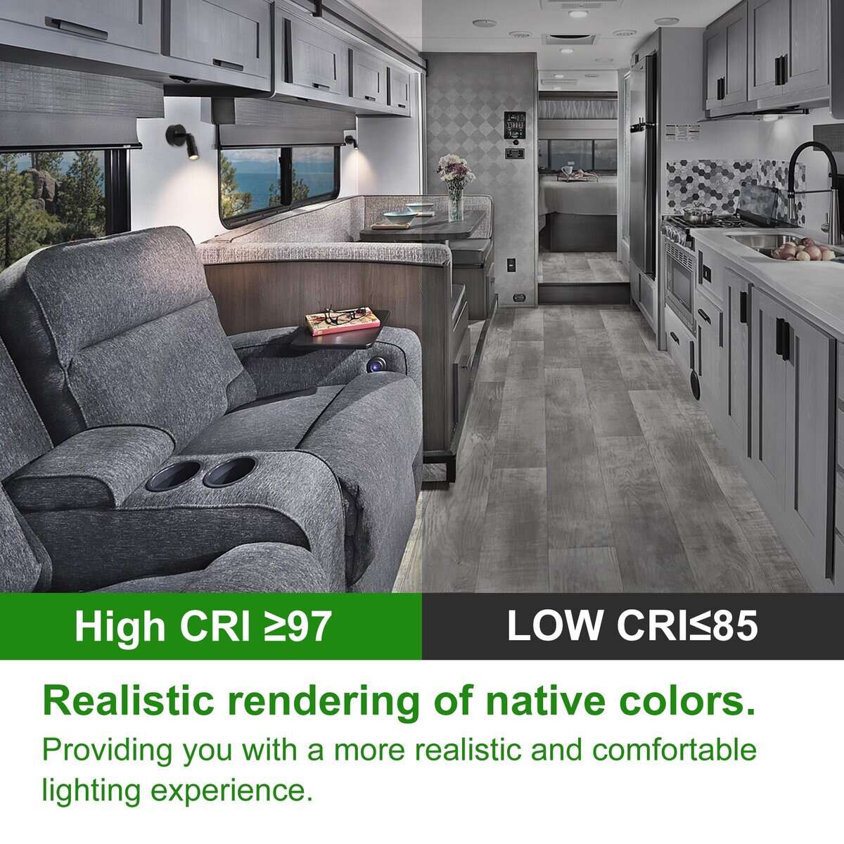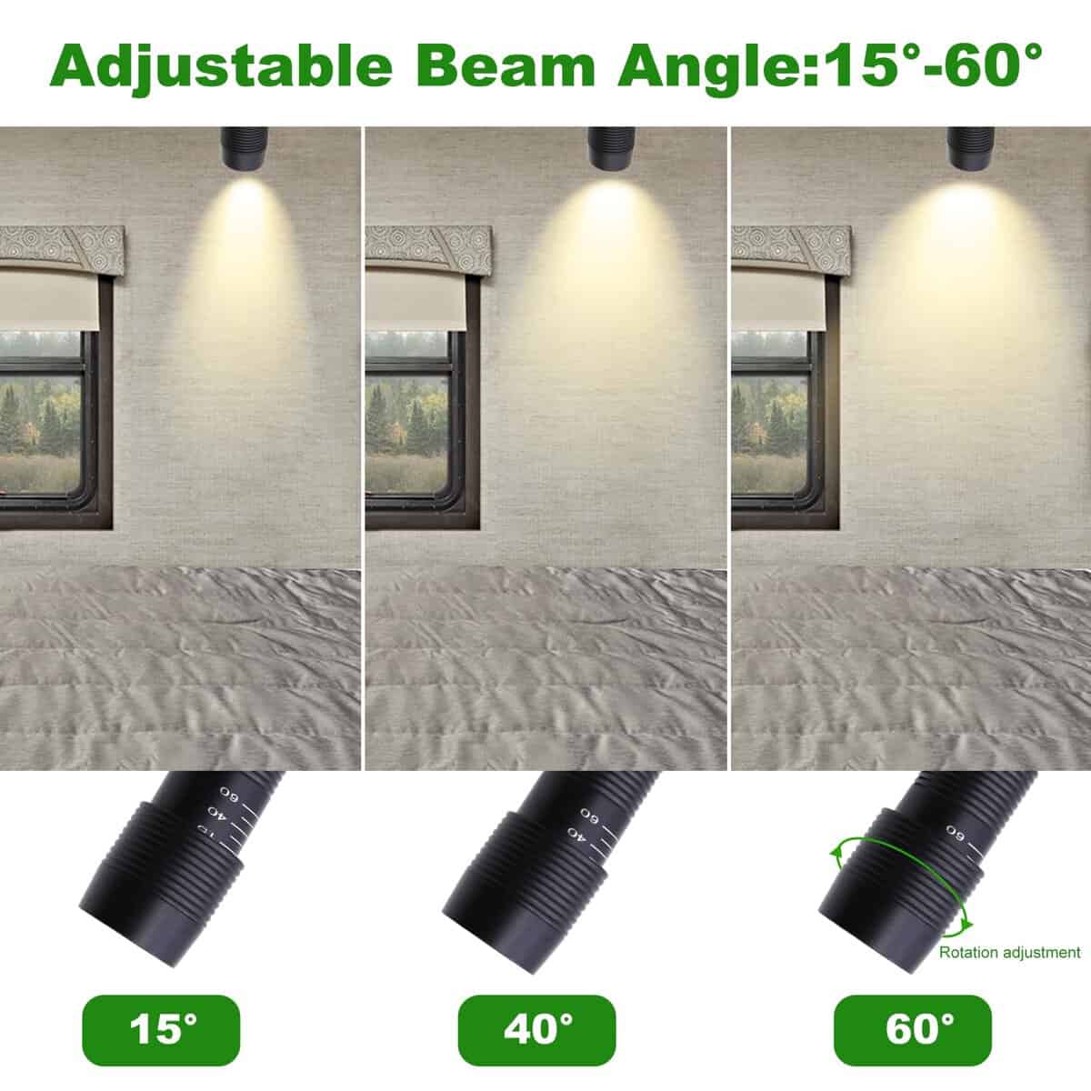 1. Iluminación Telescópica Ajustable con Zoom 2W 3500K luz blanca brillante con interruptor telescópico de 15 a 60 grados, desde foco estrecho (perfecto para leer mapas o tejer) hasta luz de inundación amplia (ideal para iluminación ambiental o lectura antes de dormir). No necesita múltiples accesorios, una luz maneja cada tarea en su RV, camper o barco.