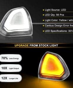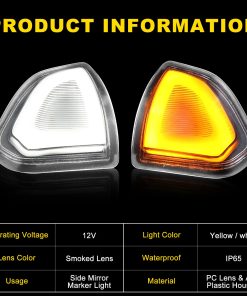 Luces de giro de repuesto drop in para los espejos de Cuarta 4ta y Quinta 5ta generación de Ram. Se iluminan con una tira LED blanca en el modo de marcha, y con una tira LED ámbar en modo de señal. Más brillante que las luces de espejo originales, hechas de lente de PC de alta calidad y plástico ABS duradero. Fáciles de instalar, sin necesidad de perforaciones ni modificaciones. Aumentan la visibilidad en la carretera y aseguran la seguridad durante la conducción.
