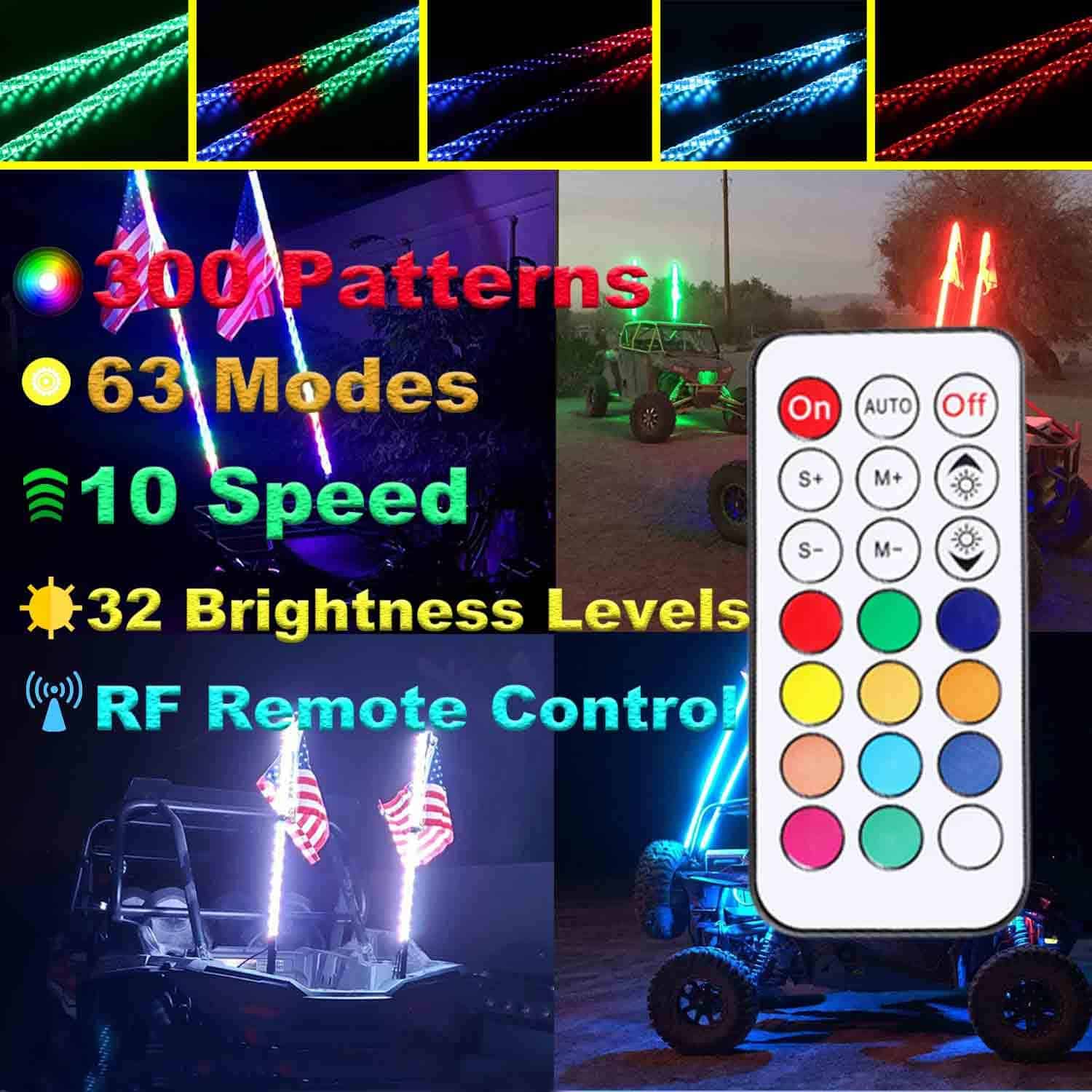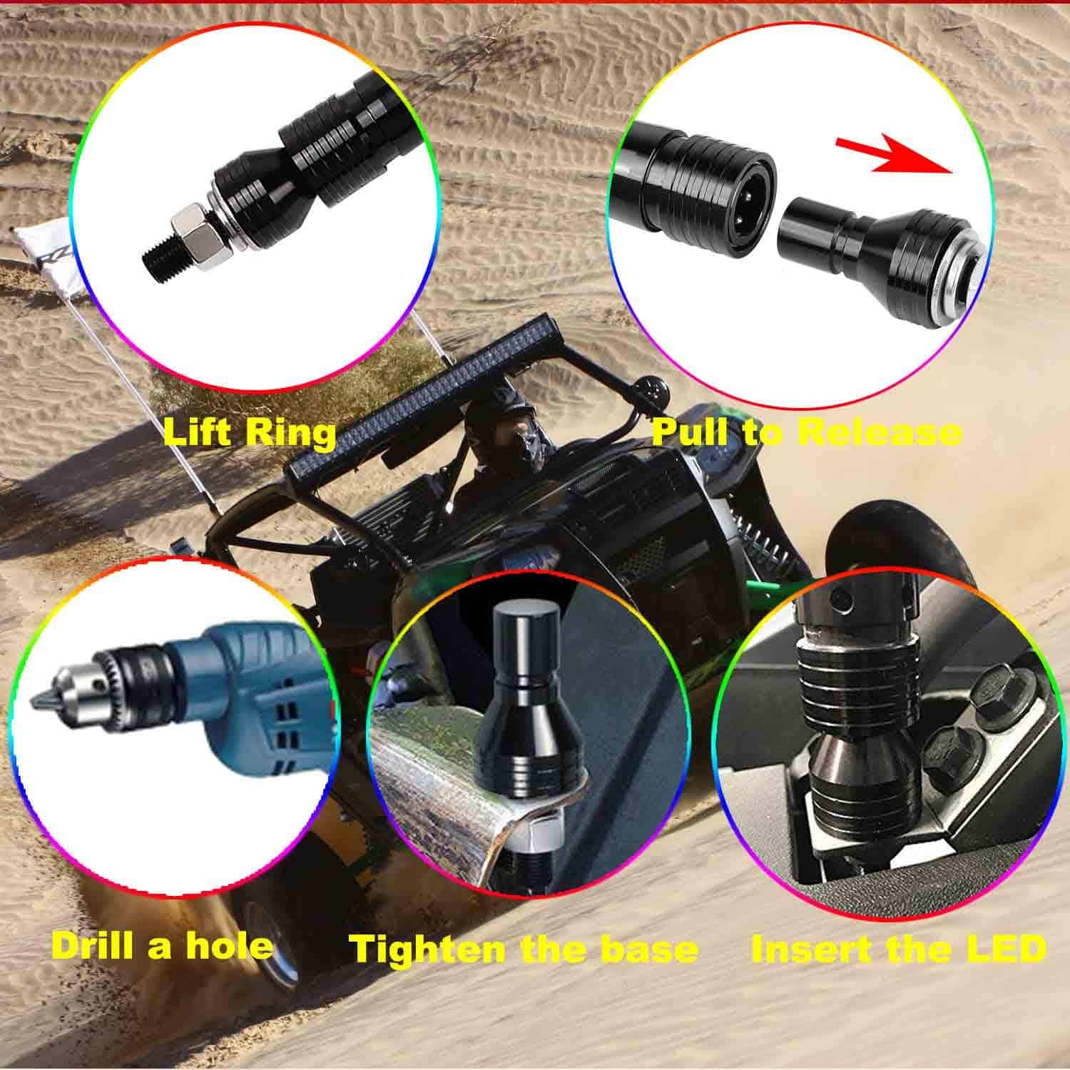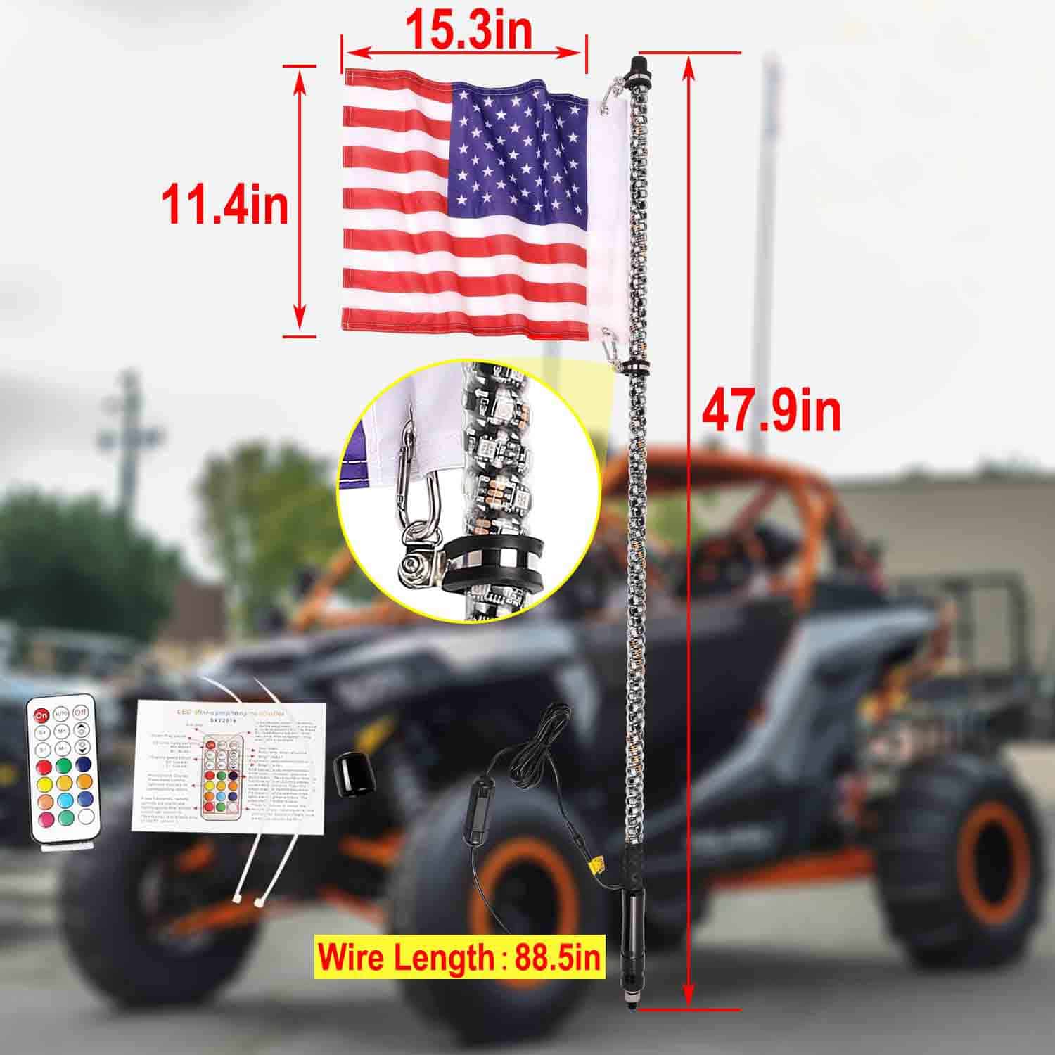 Dimensiones: Luces de látigo LED 47.9 pulgadas, Longitud del cable 88.5 pulgadas, Bandera 15.3 x 11.4 pulgadas