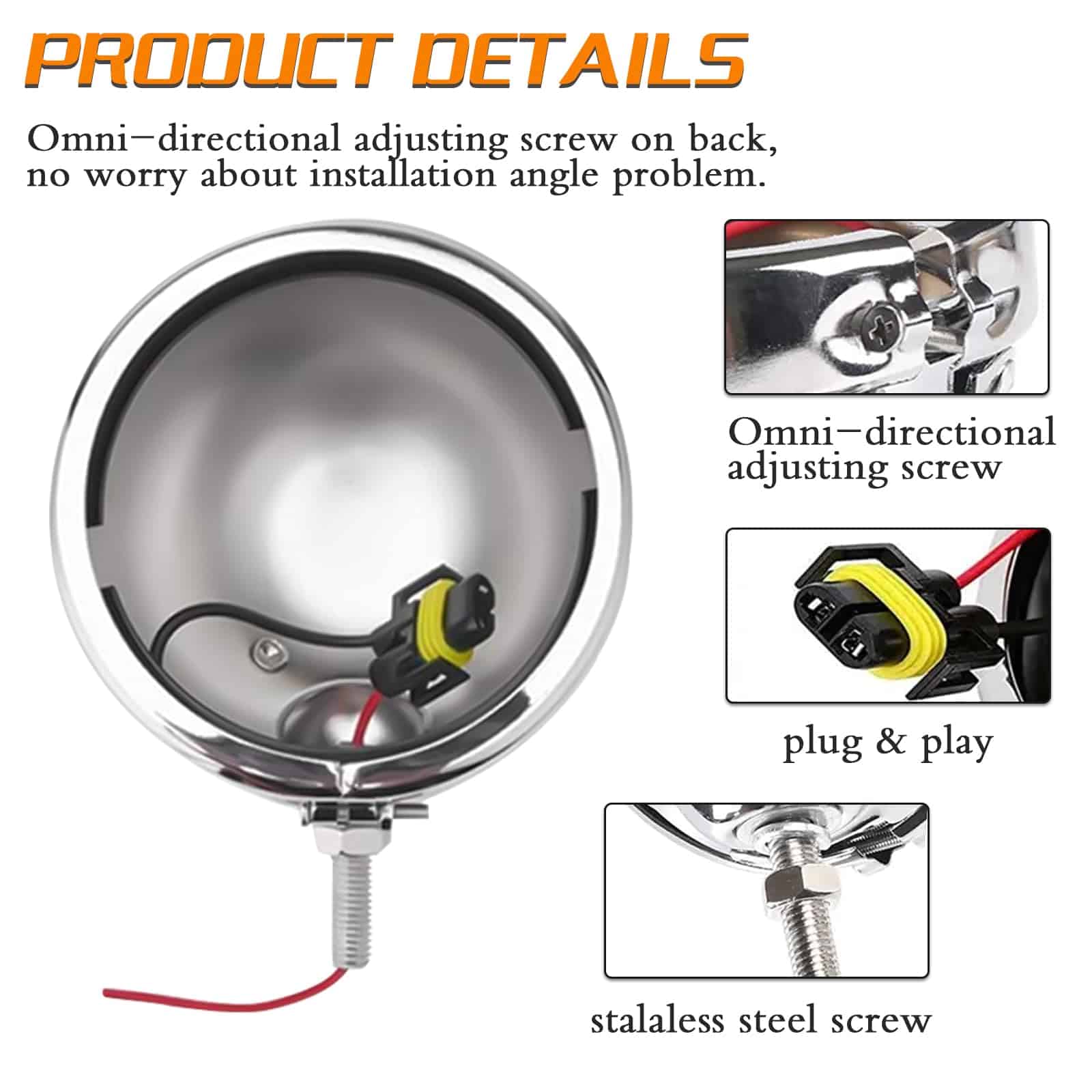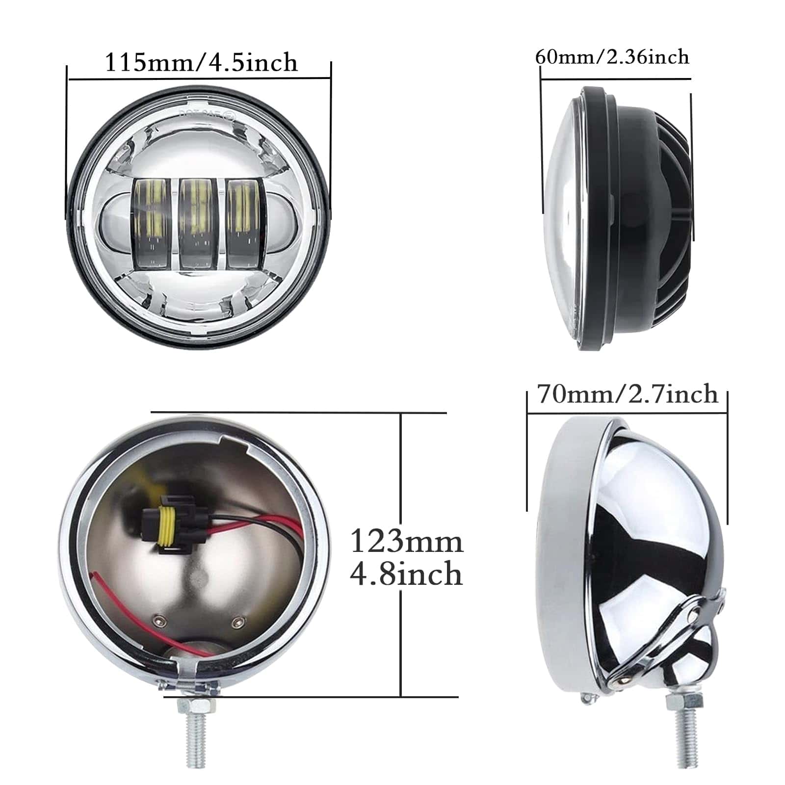 Productos relacionados: (1) Cubo negro de 4.5 pulgadas con luz LED, ASIN: B01NCOIPHU. Características del cubo de 4.5 pulgadas: 1. Se adapta a la mayoría de las luces de niebla de 4.5 pulgadas. 2. Tamaño: 123x123x70mm (4.5 pulgadas). 3. Hecho de hierro de alta calidad. 4. Fácil de instalar, es un reemplazo perfecto para la luz de niebla original y el cubo. Especificaciones de la luz de niebla de 4.5 pulgadas: -Color: Cromado -Material: Aleación de aluminio -Ubicación en el vehículo: Delantero -Tamaño: 123x123x70mm (4.5 pulgadas) Aplicaciones: Para Street Glide FLHX de 2006 a 2016, para Street Glide Trike FLHXXX de 2010 a 2011, para Street Glide Special FLHXS de 2014 a 2016, para Electra Glide de 1997 a 2013, para Road King de 1994 en adelante (Nota: este artículo no es compatible con los modelos Road Glide). Especificaciones de la luz de niebla de 4.5 pulgadas: POTENCIA: 30W 2 (10W/C LED REE) VOLTAJE: DC 10-30V LÚMENES: aprox. 1440LM 2 LEDS: 12pcs 5w CRE E LEDs VIDA ÚTIL: 50000 horas TEMPERATURA DE TRABAJO: -40 a 66 grados TEMPERATURA DE COLOR: 6000K Blanco MATERIAL: Cuerpo de aluminio fundido a presión Lente: PC Incluye: un par de luces de niebla de 4.5 pulgadas cromadas, un par de cubos de 4.5 pulgadas cromados