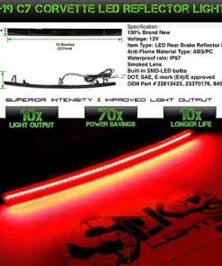 Luces de Reflector de Parachoques LED Rojas con Lente Ahumada compatibles para Chevy Corvette C7 2014-2019 Especificaciones: Nombre del producto: Luz de freno de parachoques trasera LED multifunción para Corvette C7 Color del Producto: Lente Ahumada Voltaje: 12V Ubicación en el Vehículo: Reemplazo de Luces de Estacionamiento de Reflector de Parachoques Trasero Inferior (Izquierdo y Derecho) OEM 22813423, 23370176, 84031887 Hecho por Fabricantes Aprobados por OEM y Certificados ISO Con Materiales que Cumplen o Exceden los Estrictos Requisitos de OEM Características: Lente Ahumada, Carcasa Negra Alimentado por leds rojos súper brillantes para cada kit de reflector de parachoques trasero Puede funcionar como luz de freno de parada, lámpara de niebla trasera en marcha o luz de posición roja. Luz trasera adicional para mejorar la seguridad y el estilo, dando a su Chevy Corvette C7 una mejor iluminación trasera de freno Compatible con: Chevy Corvette C7, Grand Sport, Stingray, Z06, ZR1, etc. Instalación: Recomendamos encarecidamente quitar el parachoques trasero para instalar estos reflectores de parachoques LED, porque el escape bloqueará el acceso a la parte posterior de los reflectores OEM y dificultará su extracción y reemplazo. Para esta instalación se requiere algo de cableado, simplemente enruta los cables del reflector de parachoques LED hacia la lámpara trasera del vehículo y conéctalos a tierra/luz trasera/luz de freno según corresponda, actualiza las luces de freno traseras de Corvette C7 con un nuevo aspecto de moda genial. Nota: ¡Se recomienda encarecidamente la instalación profesional! Contenido del Paquete: 2x luces de freno traseras LED con lente ahumada para Corvette C7 (Izquierdo y Derecho) 2x empalmes de cables Viene con JUEGO COMPLETO de 2 piezas (Izquierdo y Derecho) Se Requiere Cableado/Empalme para la Instalación No se incluyen Guías de Instalación, Recomendamos encarecidamente buscar instalación profesional