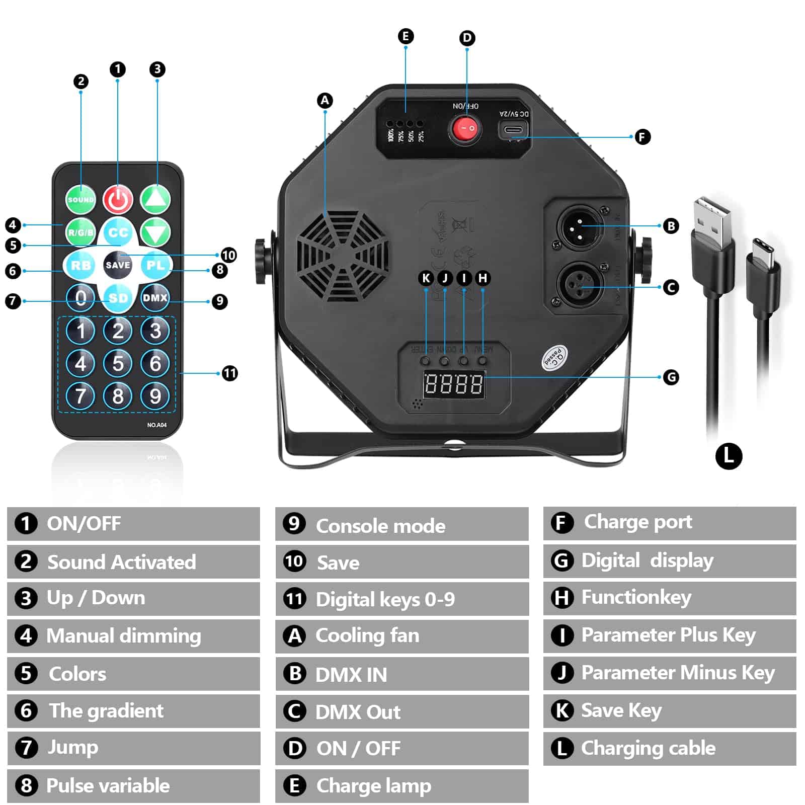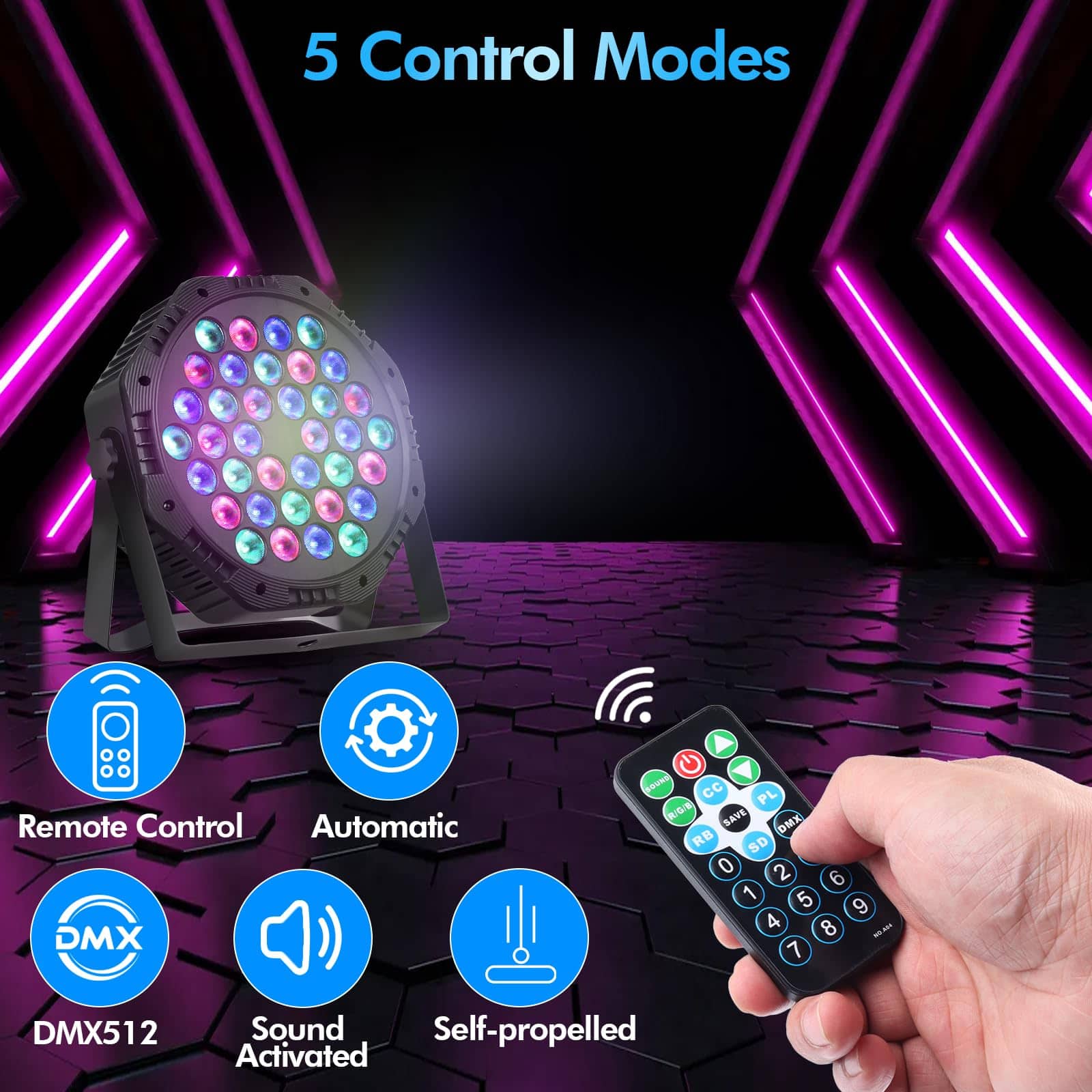 3. CONTROL REMOTO O DMX: Puede ajustar los modos de trabajo aplicables a través del control remoto. Un control remoto puede controlar varias luces. También puede usar un cable DMX conectado a la consola DMX (Modo de canal profesional de 7CH). Ya sea que sea un profesional de DMX o un comprador aficionado, los efectos de escenario se pueden controlar fácilmente.