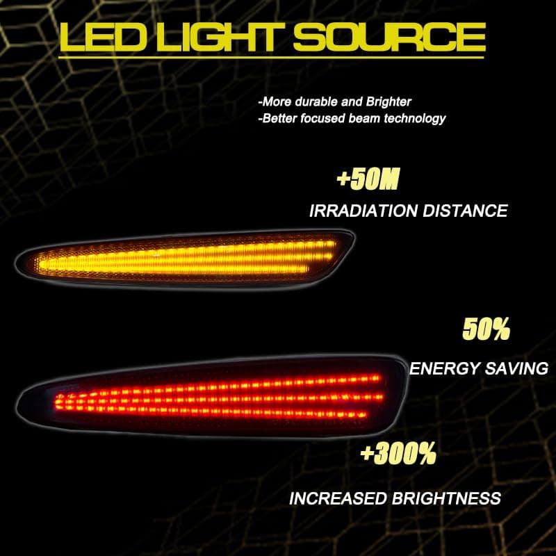 Especificación: Voltaje: 12V Material: Carcasa de plástico ABS / Lente de policarbonato Color de la lente: Negro ahumado Color de la luz: Blanco / Rojo y Amarillo Cantidad de bombillas: 90 piezas (delanteras / traseras) Posición en el vehículo: Marcador Lateral Delantero Trasero Paquete incluye: 4x Luces de marcador lateral y de giro. COMPATIBILIDAD: Para Chevrolet Corvette C6 2005-2013 Para 2005-2013 Chevrolet Corvette C6 Base, Z06, ZR1, 427 Edición Limitada Z06, Grand Sport, Z06 Carbon Para 2005-2013 Chevy Corvette C6 Base, Z06, ZR1, 427 Edición Limitada Z06, Grand Sport, Z06 Carbon Número de pieza OEM: GM 10316651 10316652 10316656 10440722.