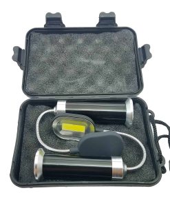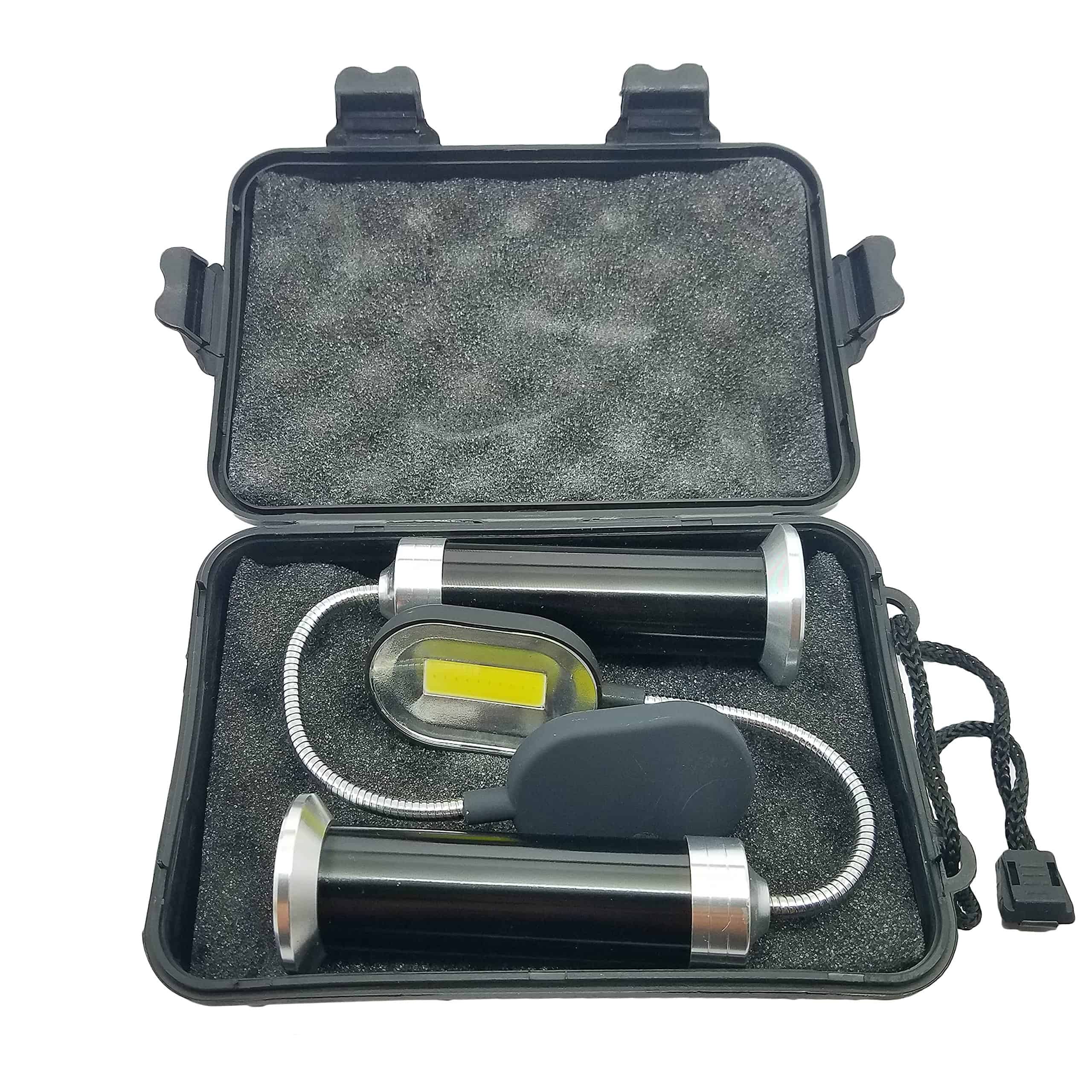 2 Luces de Parrilla Negras de Tecnología COB LED. ¡6 pilas alcalinas AAA INCLUIDAS! 1 Estuche de plástico negro reutilizable con cierre con espuma en el interior.