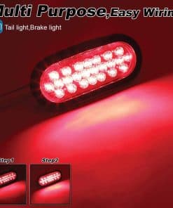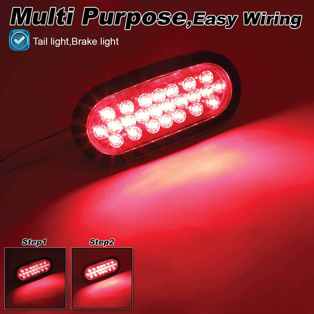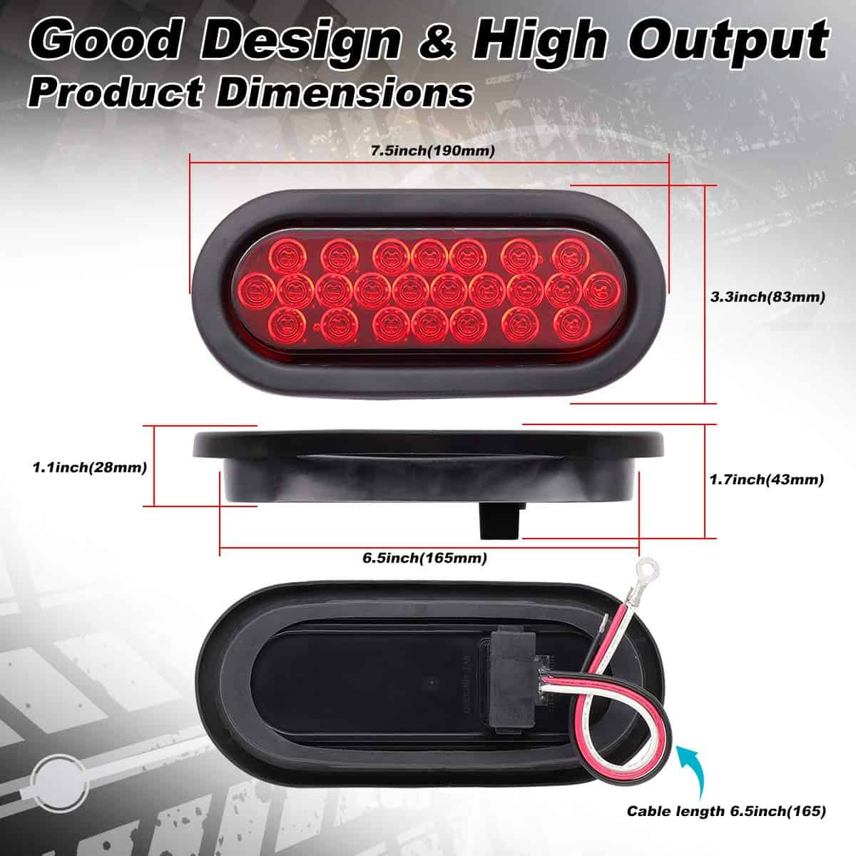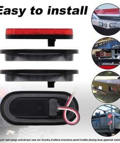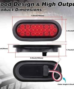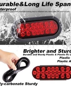 Luces marcadoras laterales ovales de 6 pulgadas con 24 LED en color rojo para remolques, camiones, caravanas, tractores, autobuses, semirremolques, volquetes, barcos, campistas, Jeeps, RVs, etc. Las bombillas se pueden utilizar como luz de remolque, luz intermitente, luz de giro, luz trasera, luz de emergencia; Compatible con la mayoría de vehículos de 12v DC. Conector estándar de la industria con cableado de 10.5 pulgadas y 3 pines; el Negro es positivo para la luz trasera, el Rojo es positivo para la luz de freno, el Blanco es cable a tierra.